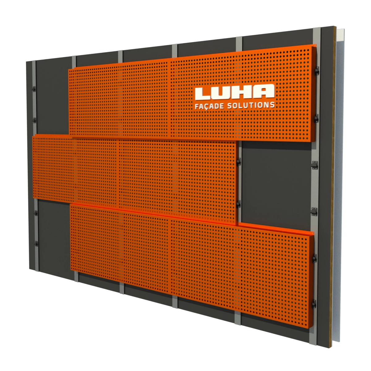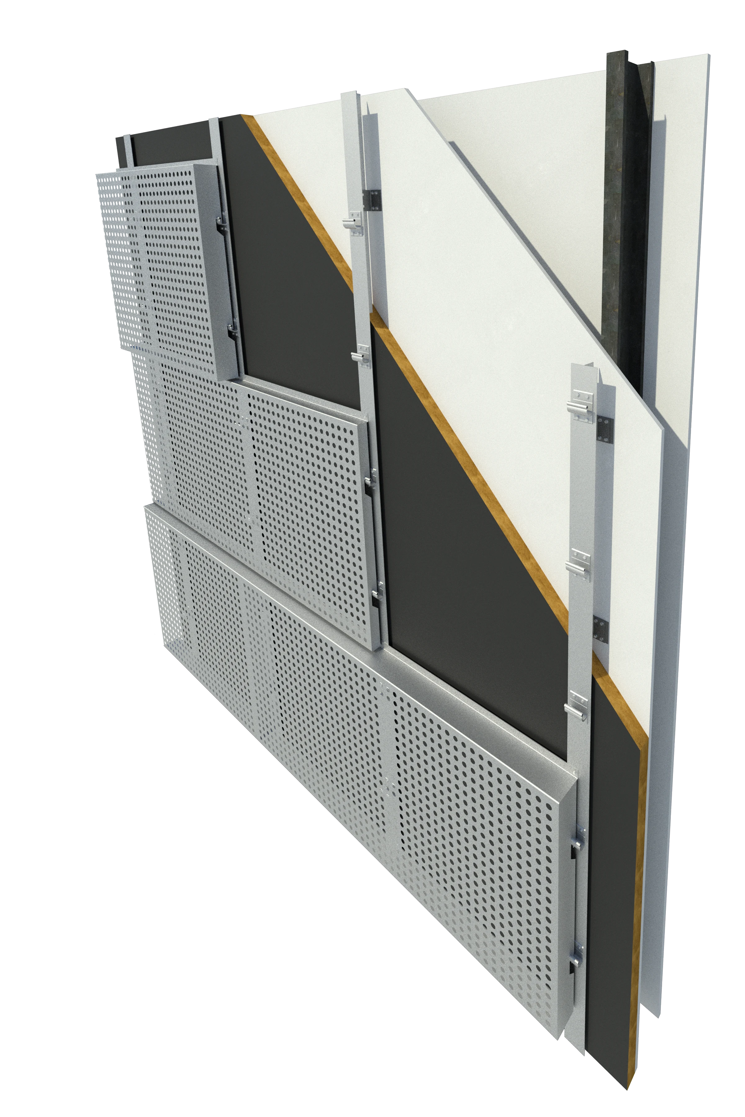 3D mockup showcasing a perforated metal panel system, including panels and backup system components supplied by Luha.