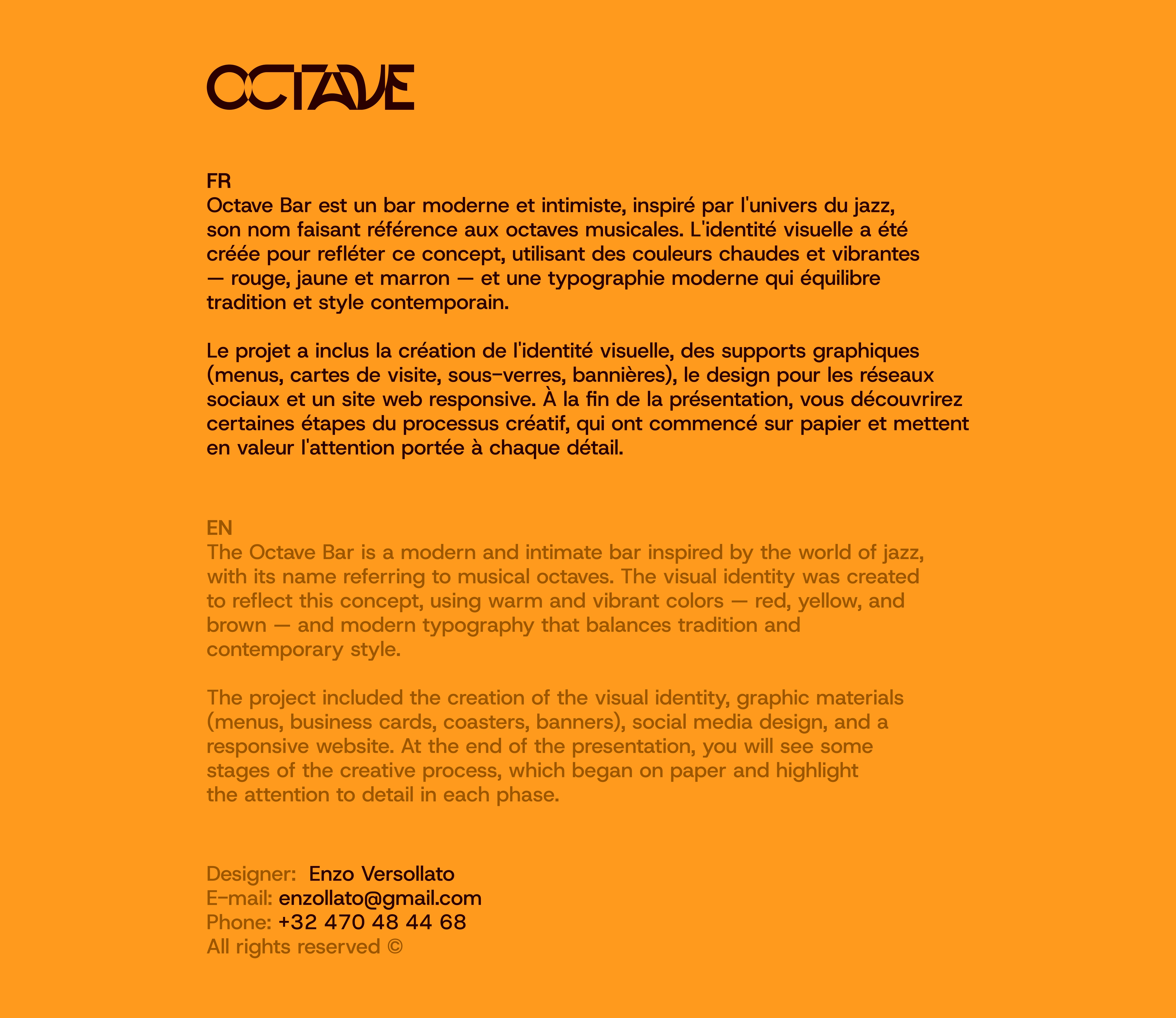 The project included the creation of the visual identity, graphic materials (menus, business cards, coasters), social media design, and a responsive website.