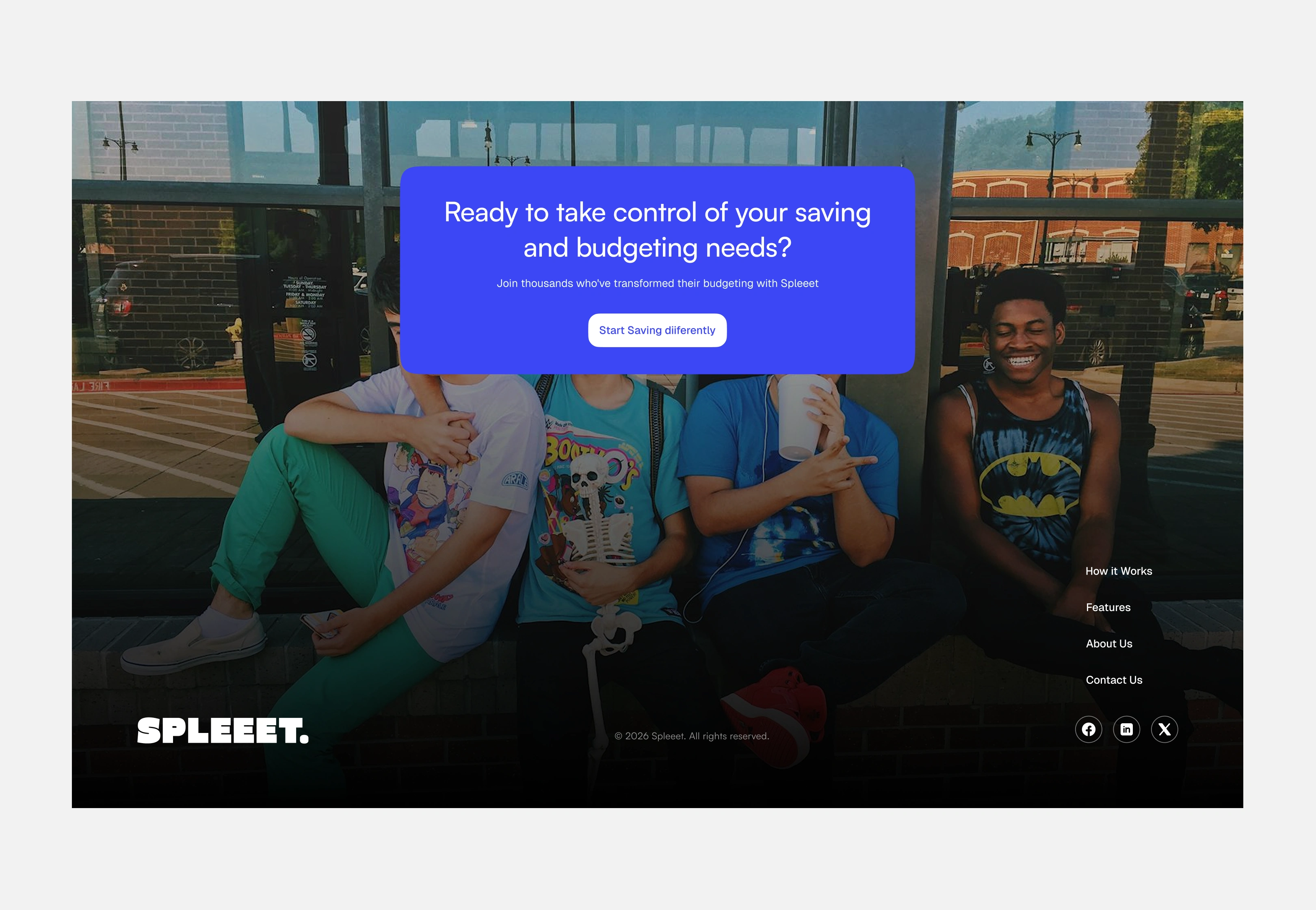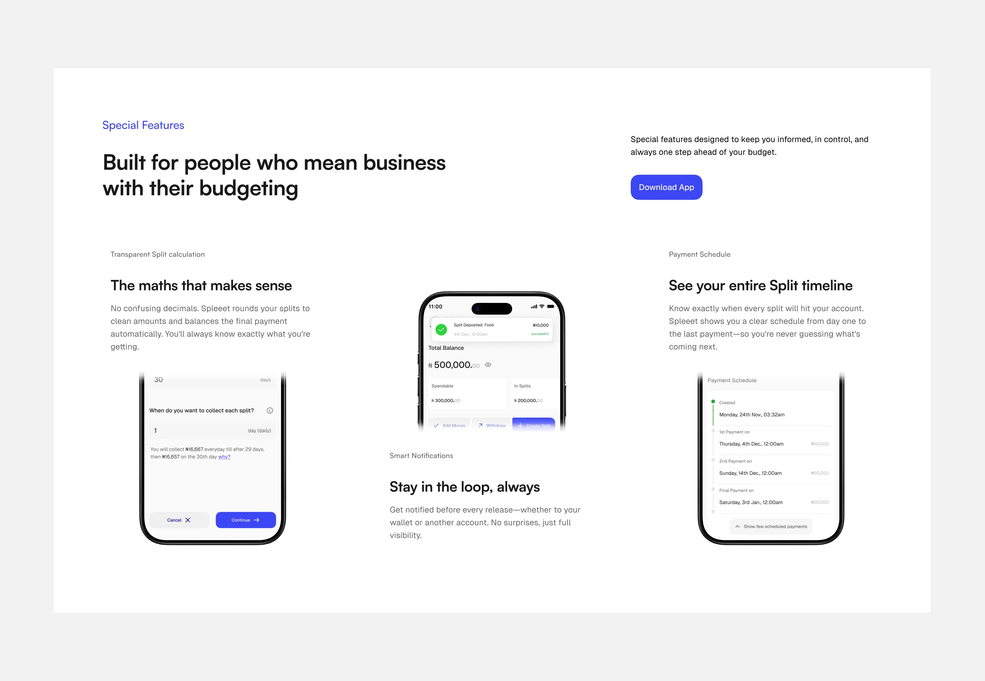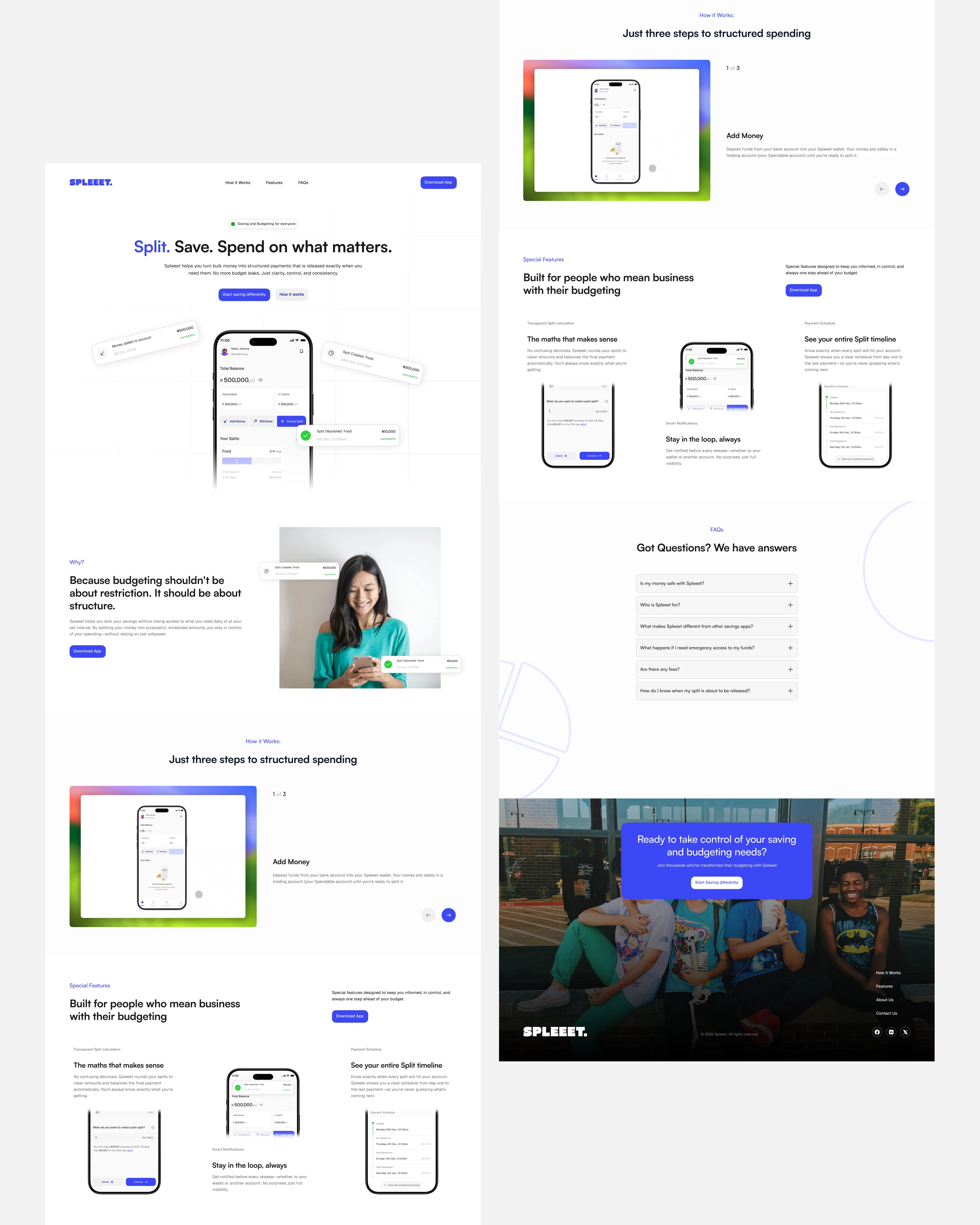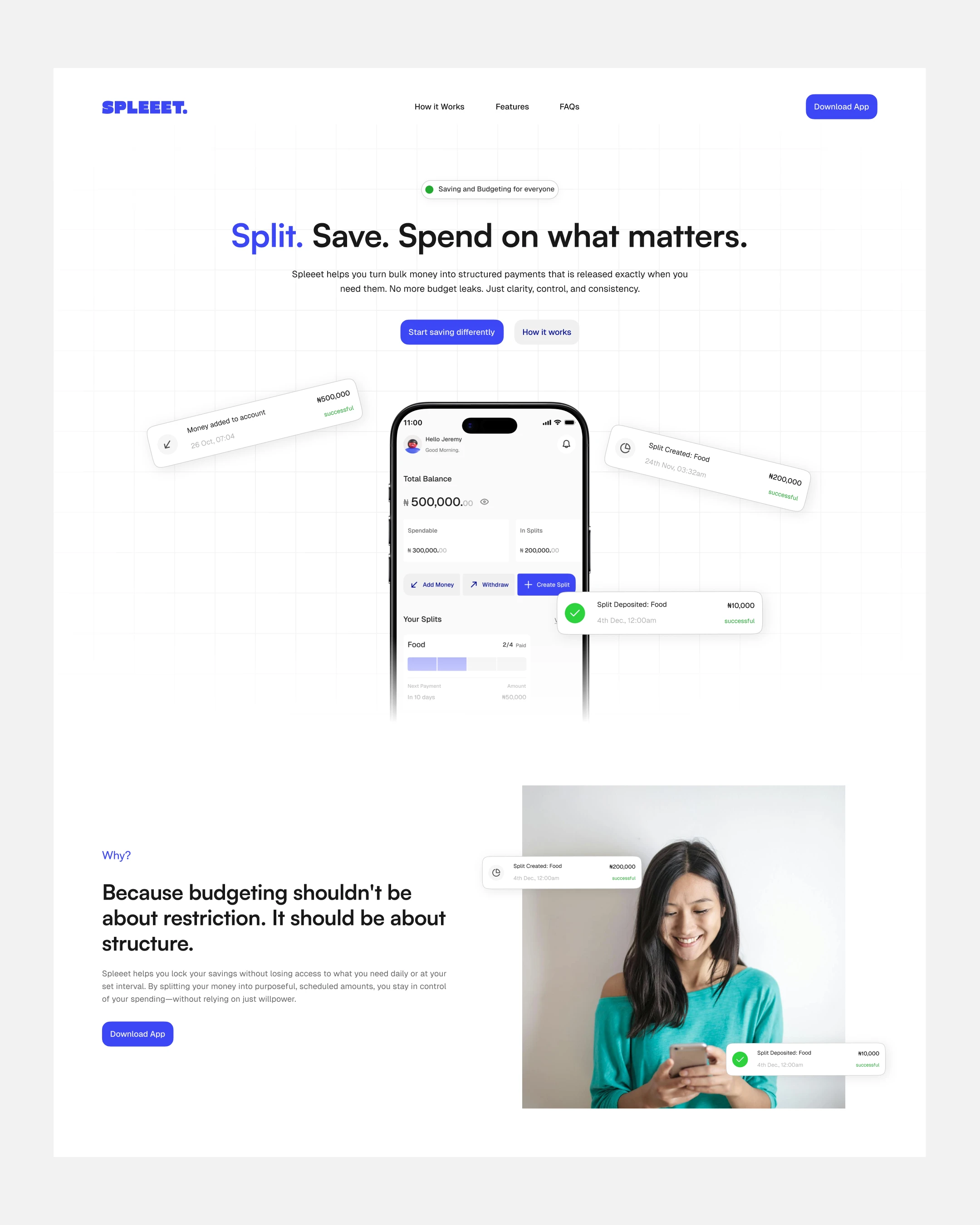A mobile app landing page designed for Spleeet, a fintech concept built around one simple idea: helping people stick to their financial plans. Spleeet works by letting users lock away a bulk sum of money and automatically splitting it into smaller, scheduled portions — released daily, weekly, monthly, or on any custom interval the user sets. This way, you only ever spend on what you planned to.
