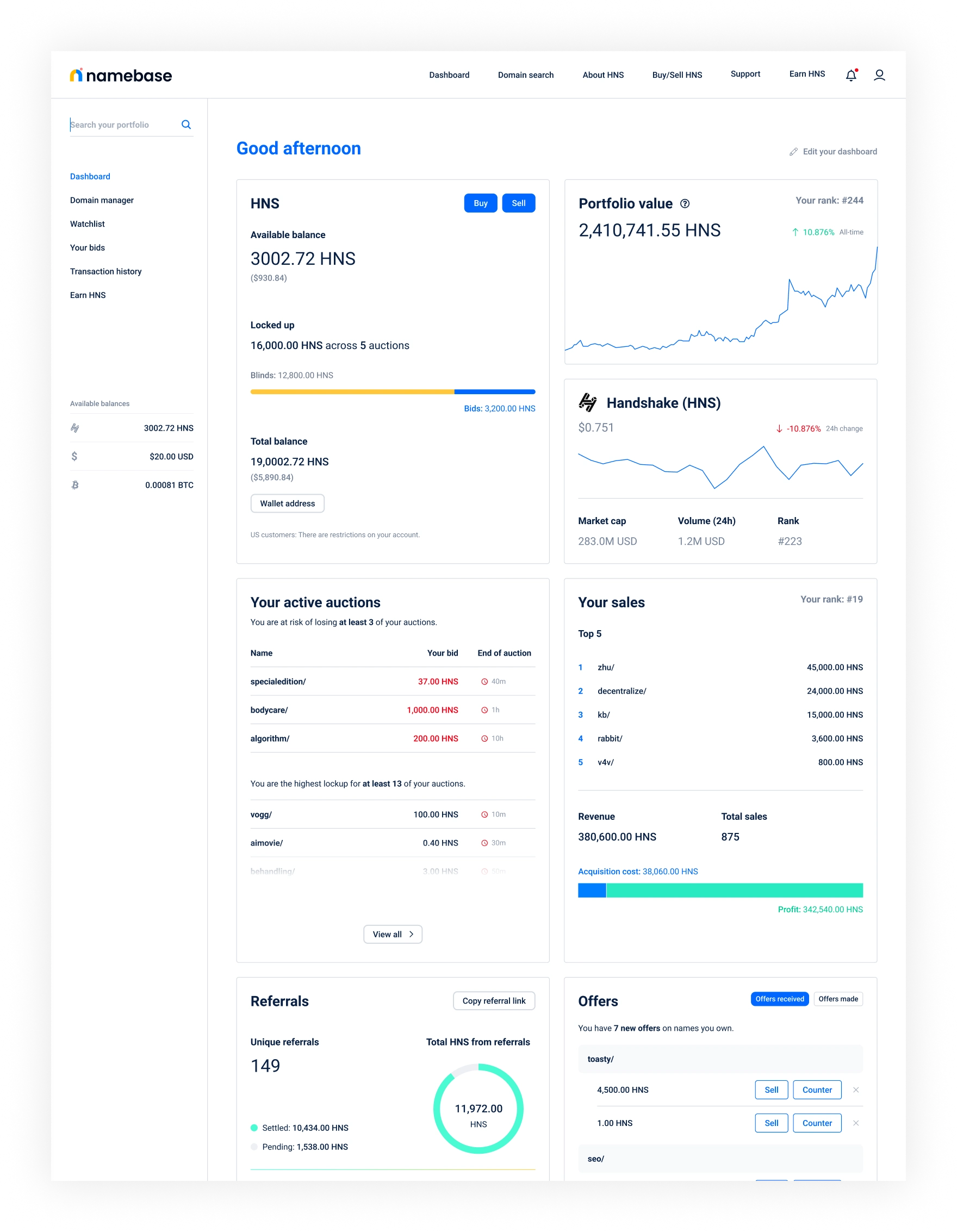 Namebase is an onramp for the Handshake blockchain — an interface for interacting with the chain. It is an exchange, wallet, marketplace, and domain registrar for Handshake (think if Coinbase and GoDaddy had a baby.)