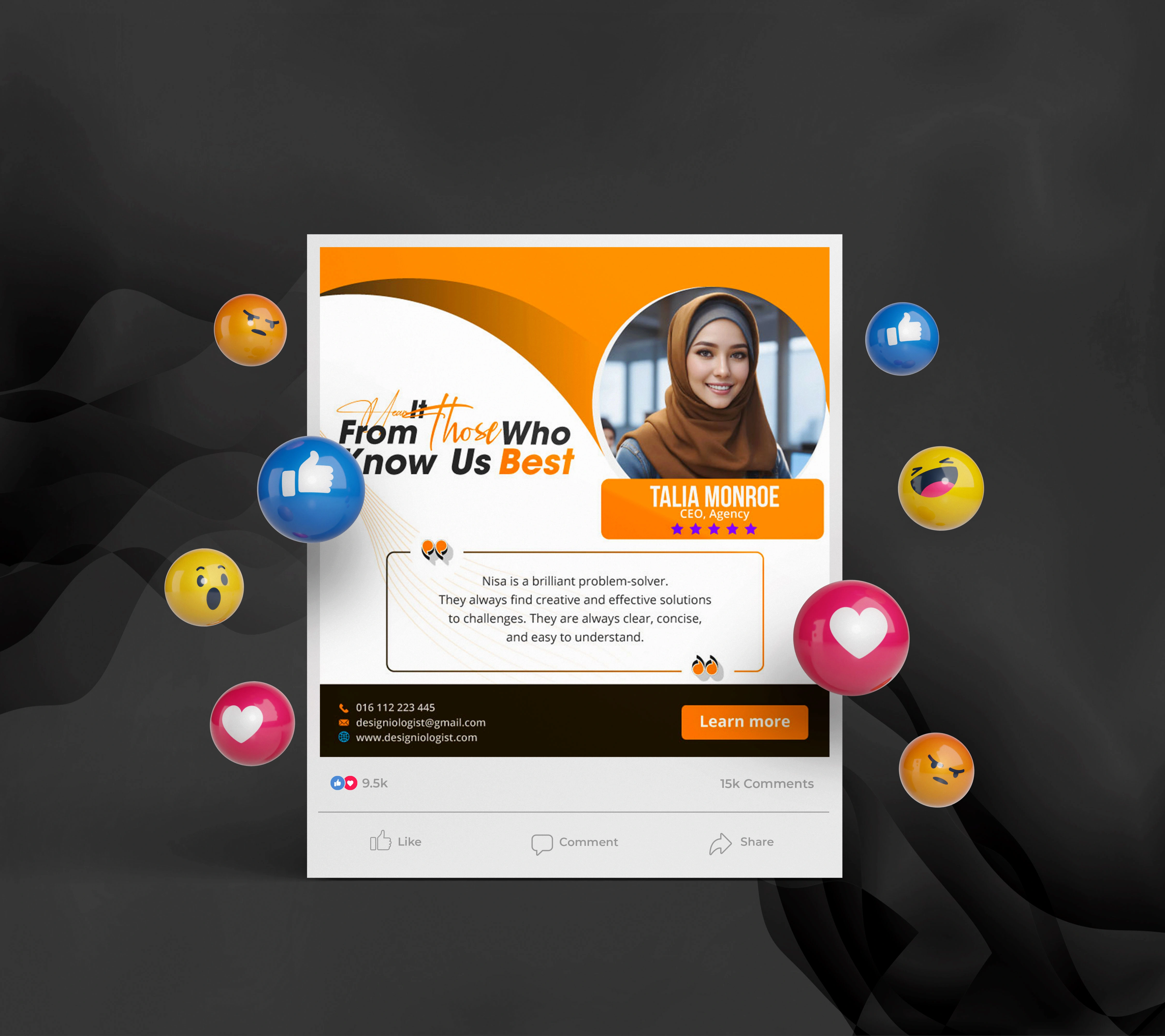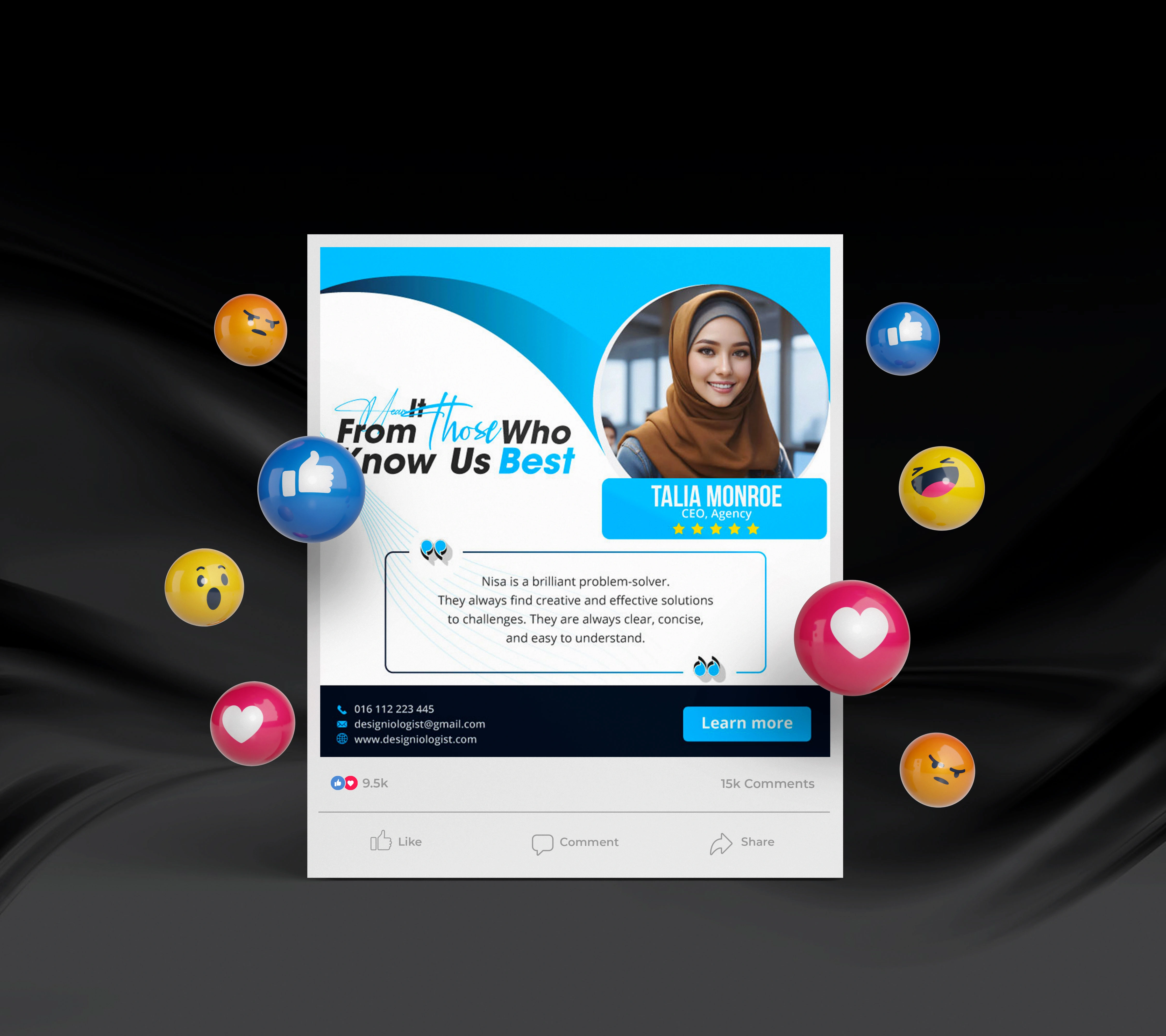 I was hired as a freelance designer to create sleek and modern client testimonial visuals for a digital brand looking to enhance credibility through clean and high-impact feedback displays. The goal was to design testimonial components that are visually consistent, easy to read, and aligned with the brand’s overall aesthetic.