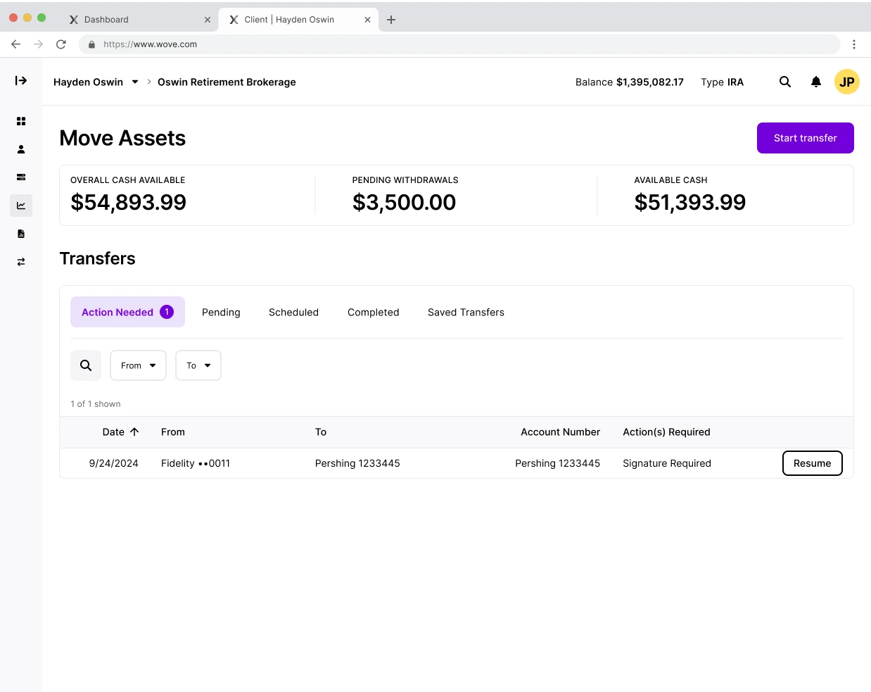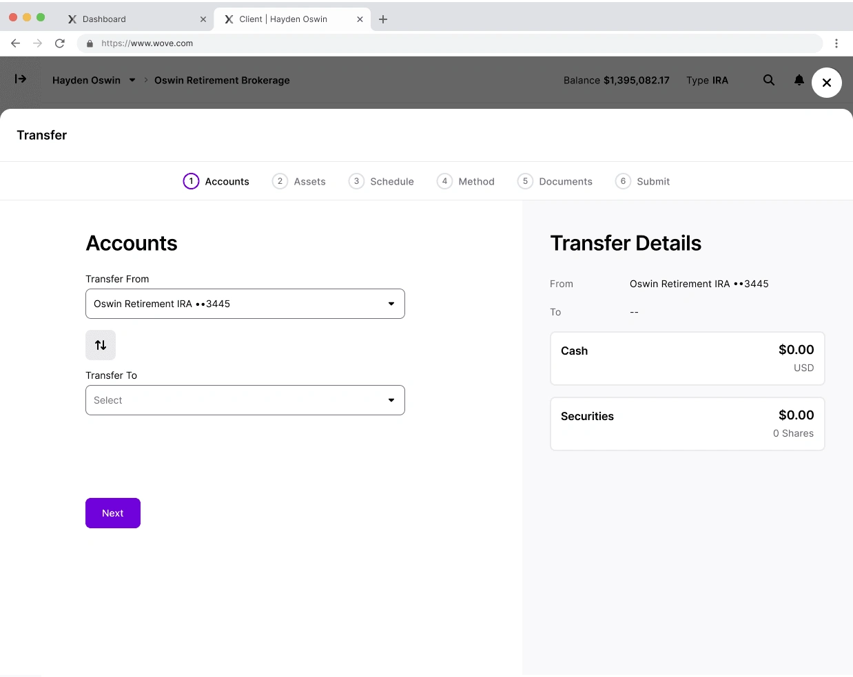 The goal was to redesign the Move Assets process to provide financial professionals with an efficient and user-friendly experience for transferring assets across accounts.