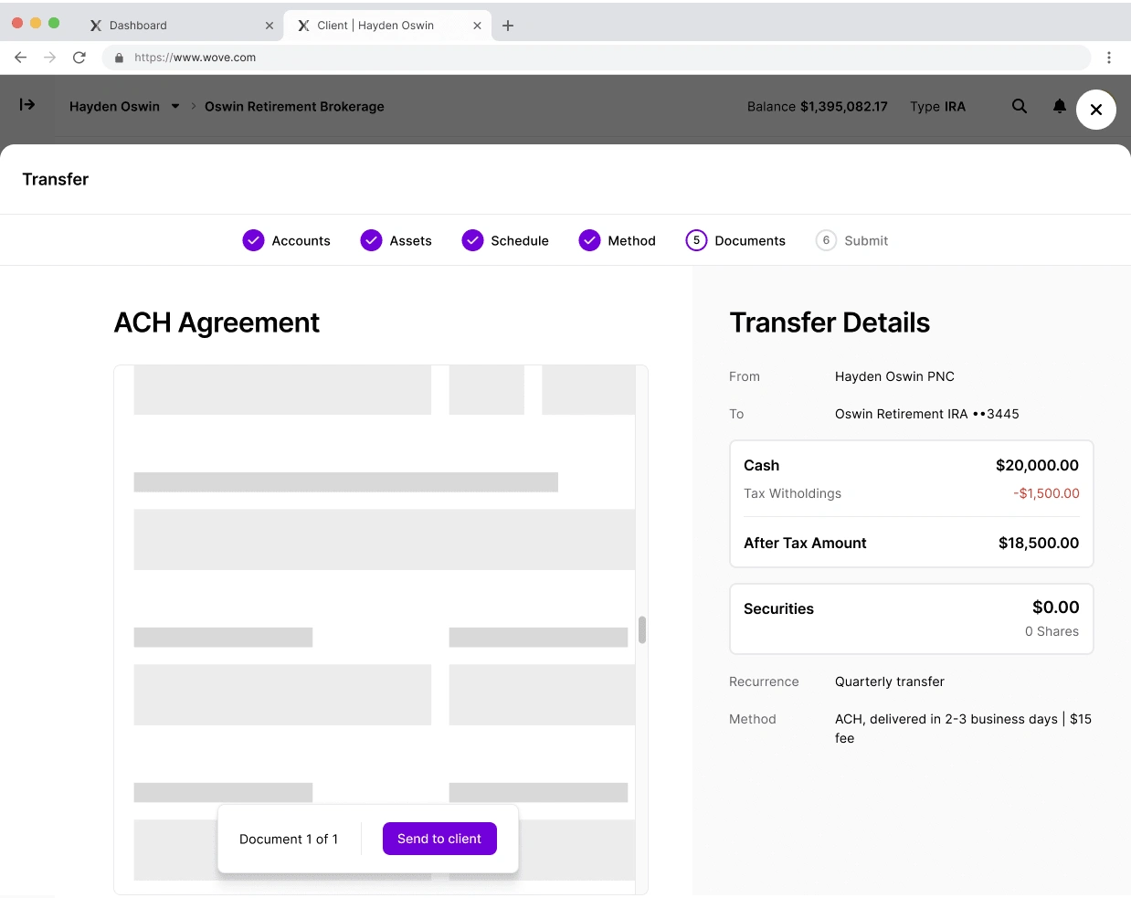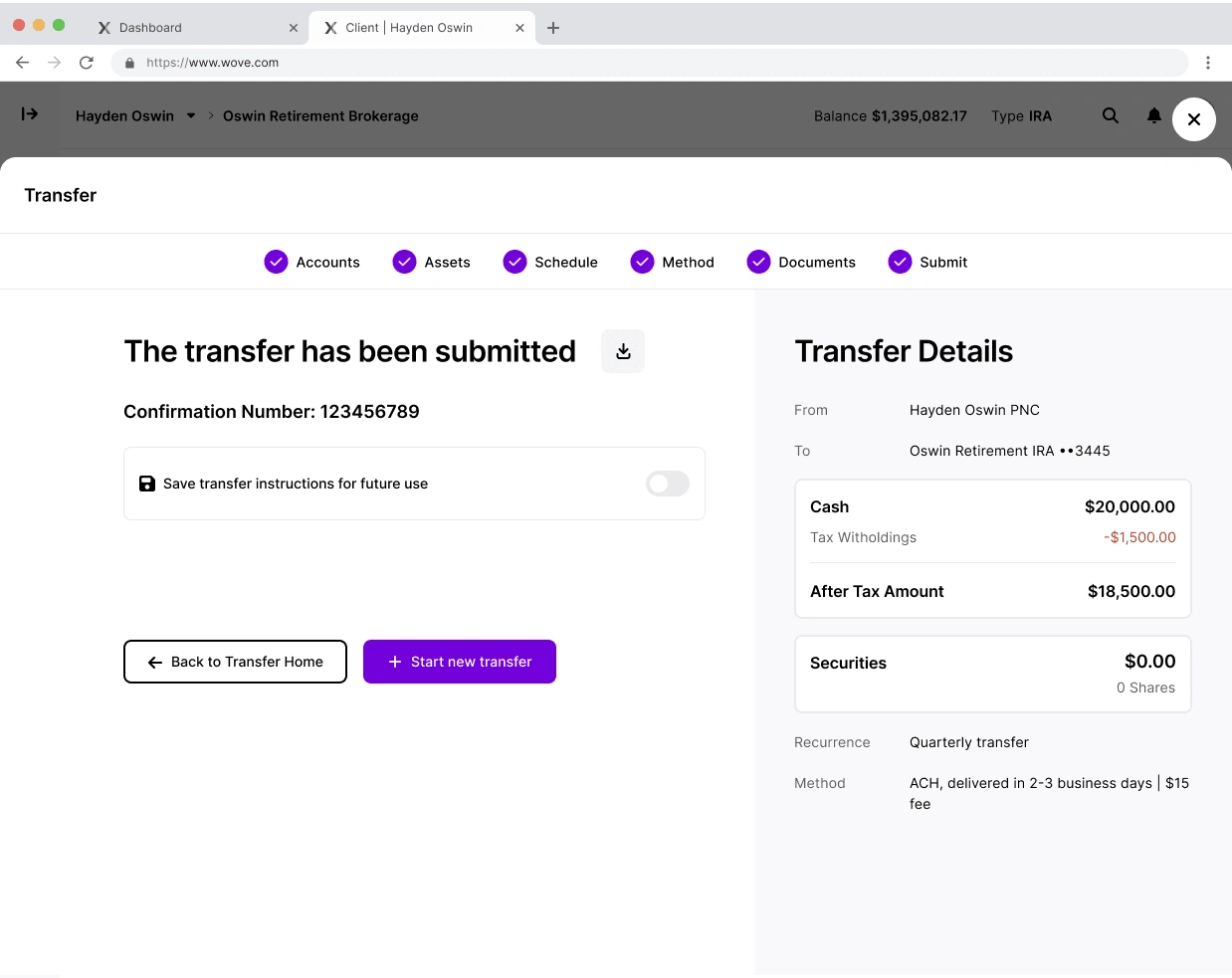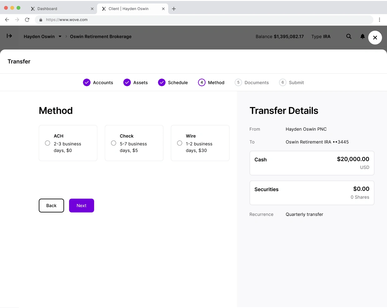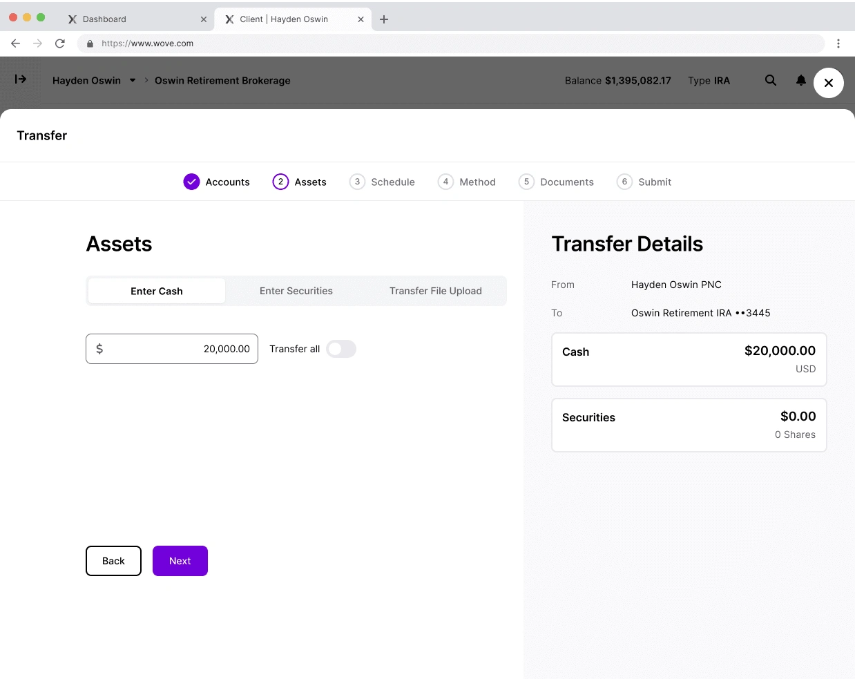 The existing asset movement workflow was complex and a disjointed user experience. The challenge was to create a cohesive process that streamlined transfers while integrating seamlessly into the unified Wove platform.