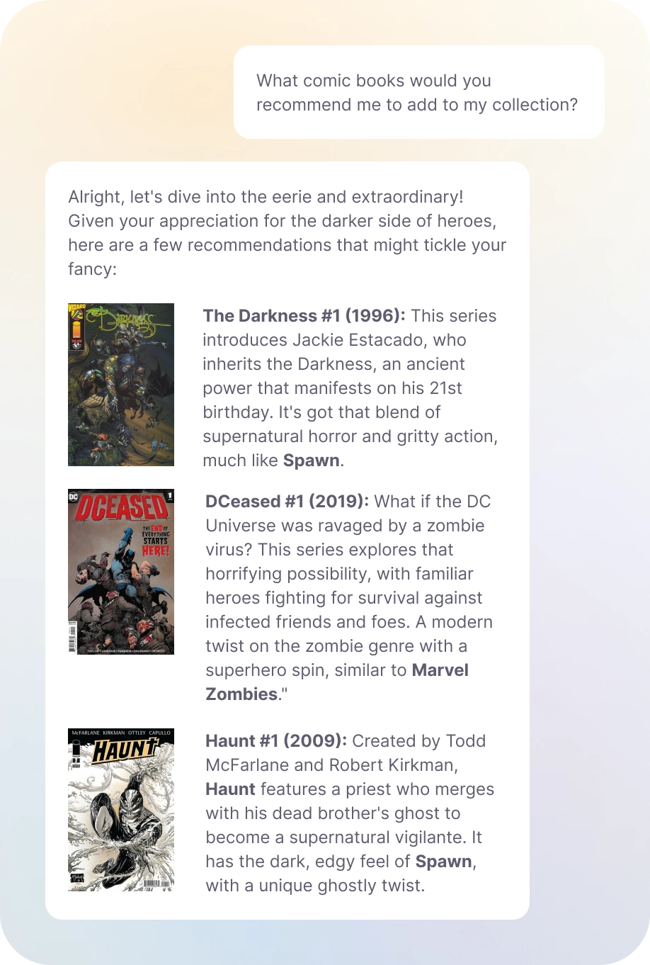 The application allows users to manage their comic book collections, but users often want deeper insights: recommendations aligned with their taste, answers about authors or storylines, and contextual knowledge about characters and first appearances. The goal was to build an AI assistant backend that could power these features reliably and at scale.