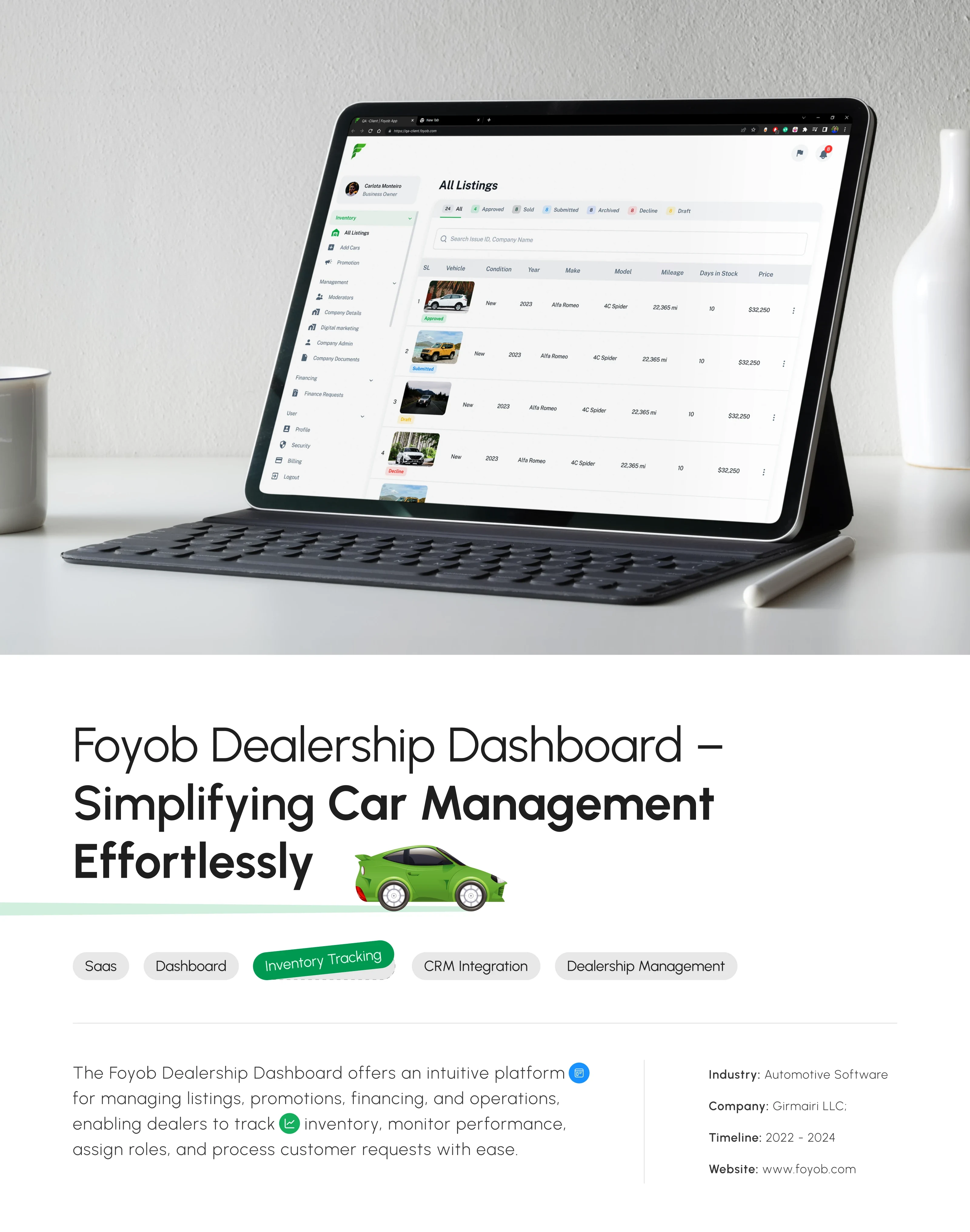 The Foyob Dealer Dashboard streamlines inventory, financing, and team roles. Unlike buyer-centric sites, it’s a dealer-first platform for real-time management.