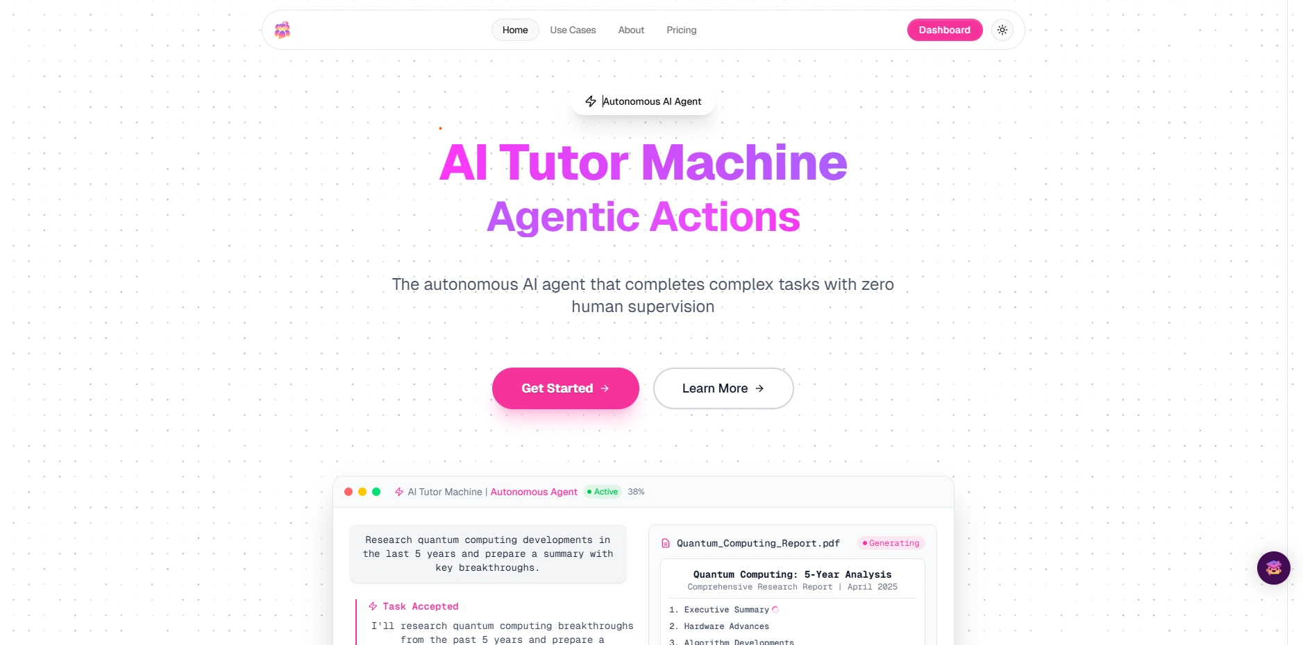 AI Tutor Machine is an autonomous AI agent designed to handle complex tasks independently, without the need for constant human supervision. It leverages advanced reasoning, digital tools, and real-time adaptability to deliver accurate results across diverse domains.