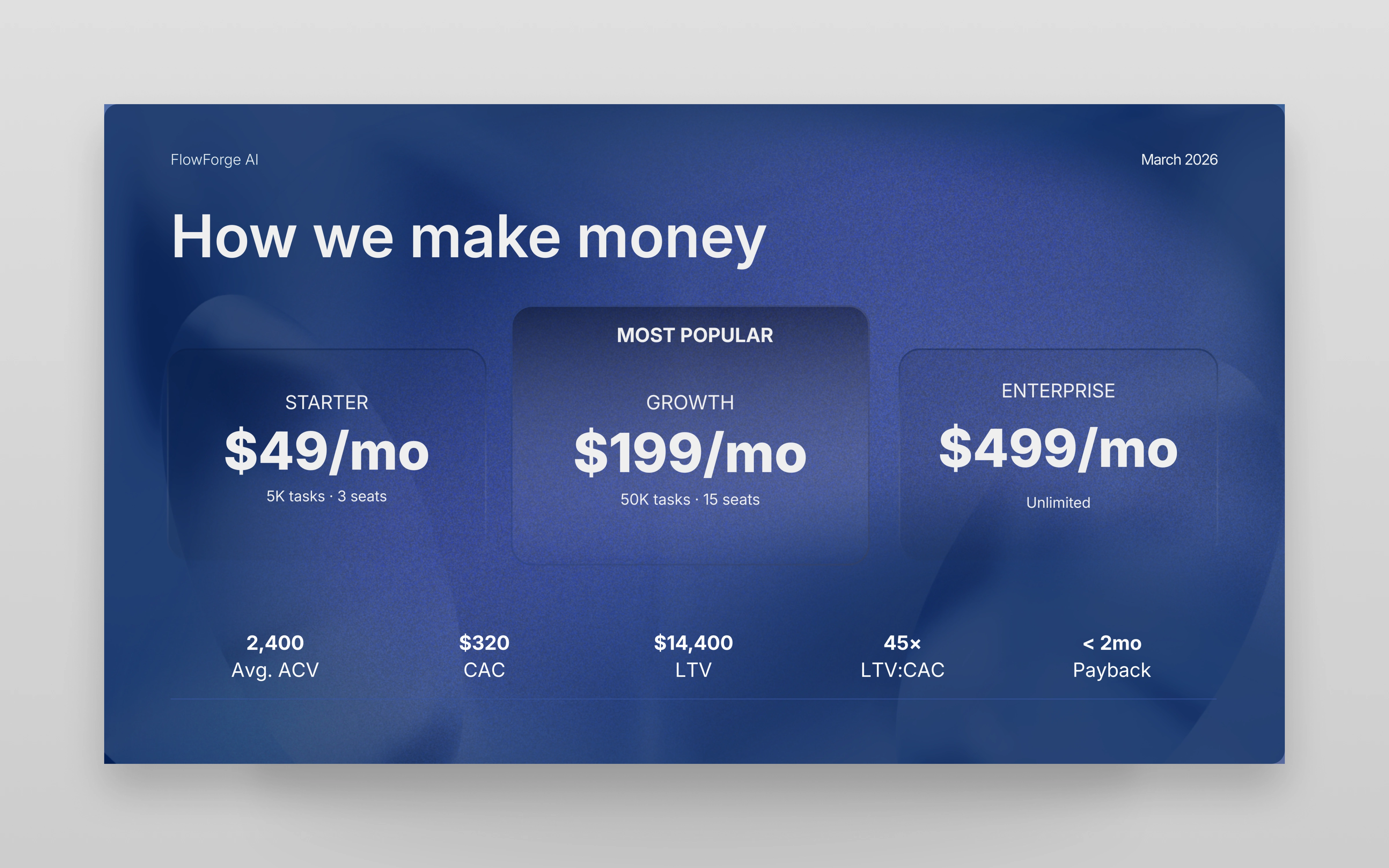 • Clear visual hierarchy – Structured slides to guide the viewer through problem, solution, product, and growth strategy.
