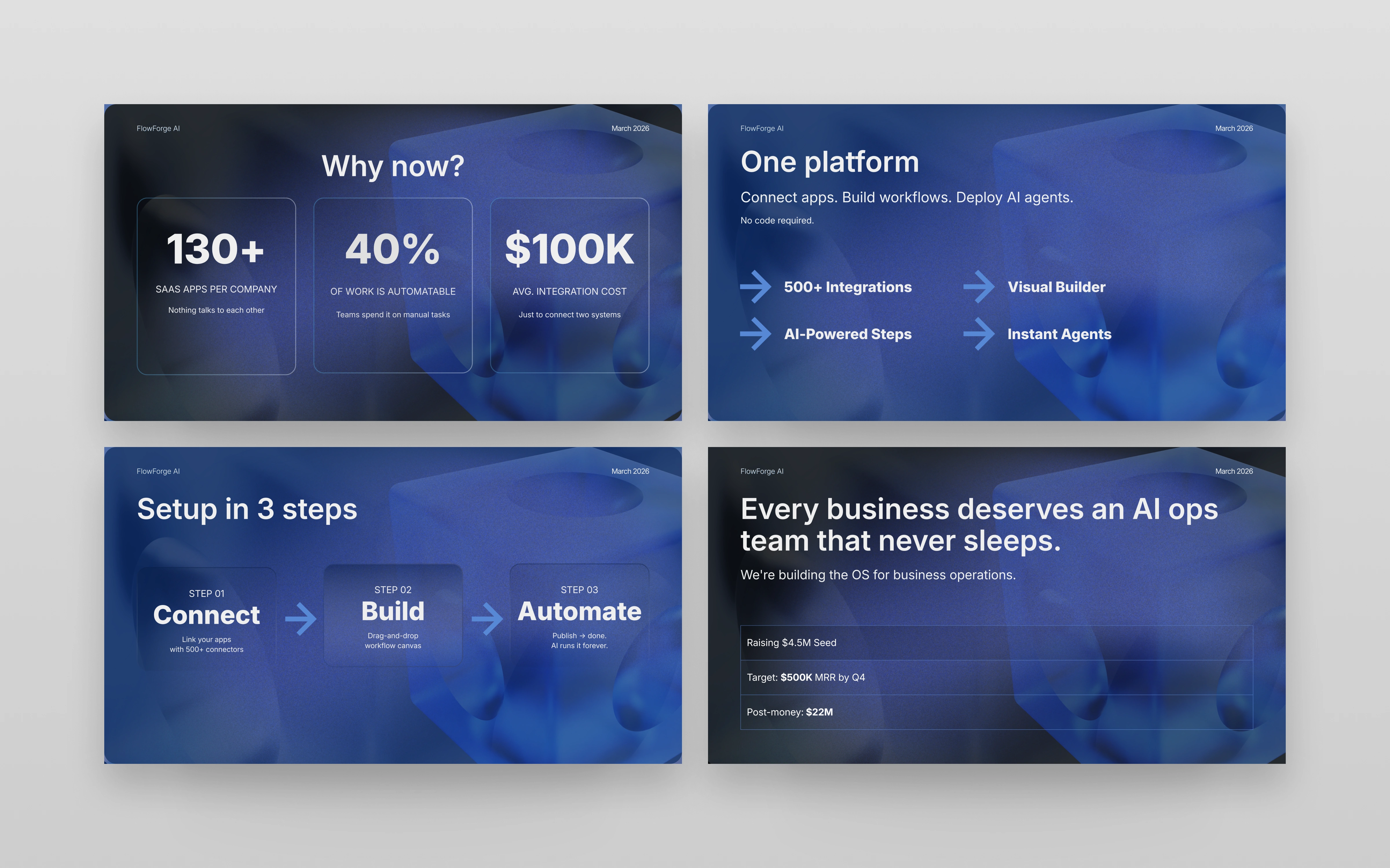 • Modern SaaS aesthetic – Clean typography, structured grids, and minimal color usage to keep the presentation professional and investor-friendly.