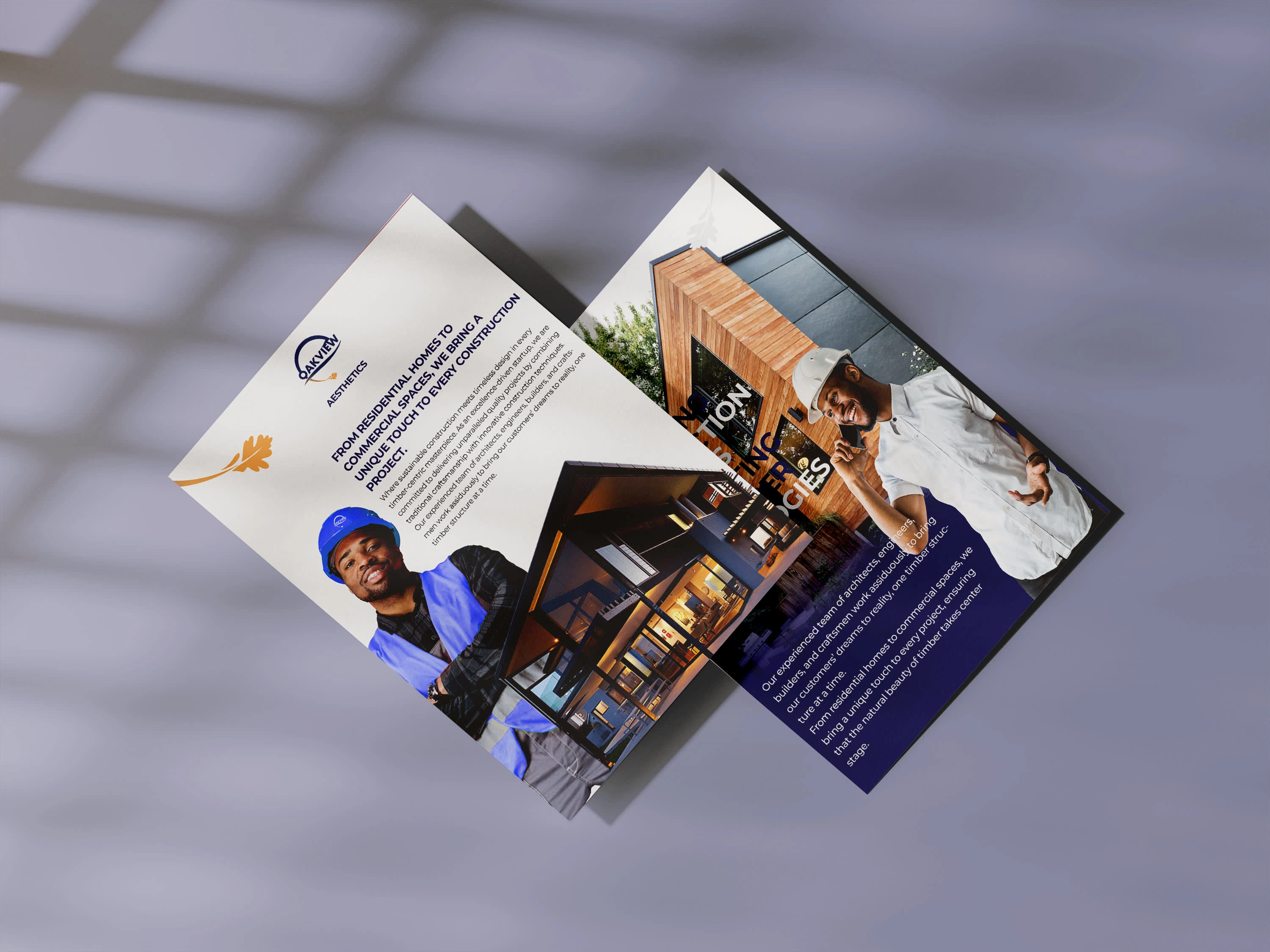 To solve this, I designed a visually compelling flyer that balances strong imagery with clean, confident layout choices. I used real on-site visuals to humanize the brand and bold architectural shots to show capability, pairing these with well-structured messaging that explains their expertise in both residential and commercial construction. The color palette, typography, and composition were intentionally chosen to elevate their brand presence, create credibility at first glance, and help them stand out in a highly competitive industry. This final design serves as a clear, modern, and persuasive communication piece that effectively positions Oakview Aesthetic as a trustworthy and skilled construction service provider.