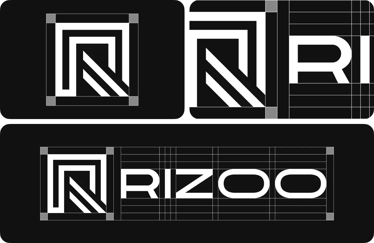 The base measurement for defining this protective area is derived from the logo itself. We use the "1x" proportion, where "x" represents the height of one of the internal elements of the Rizoo symbol, as illustrated. This rule applies equally on all four sides, top, bottom, left, and right, creating a consistent safety margin that protects the legibility, balance, and elegance of the Rizoo identity in every application.