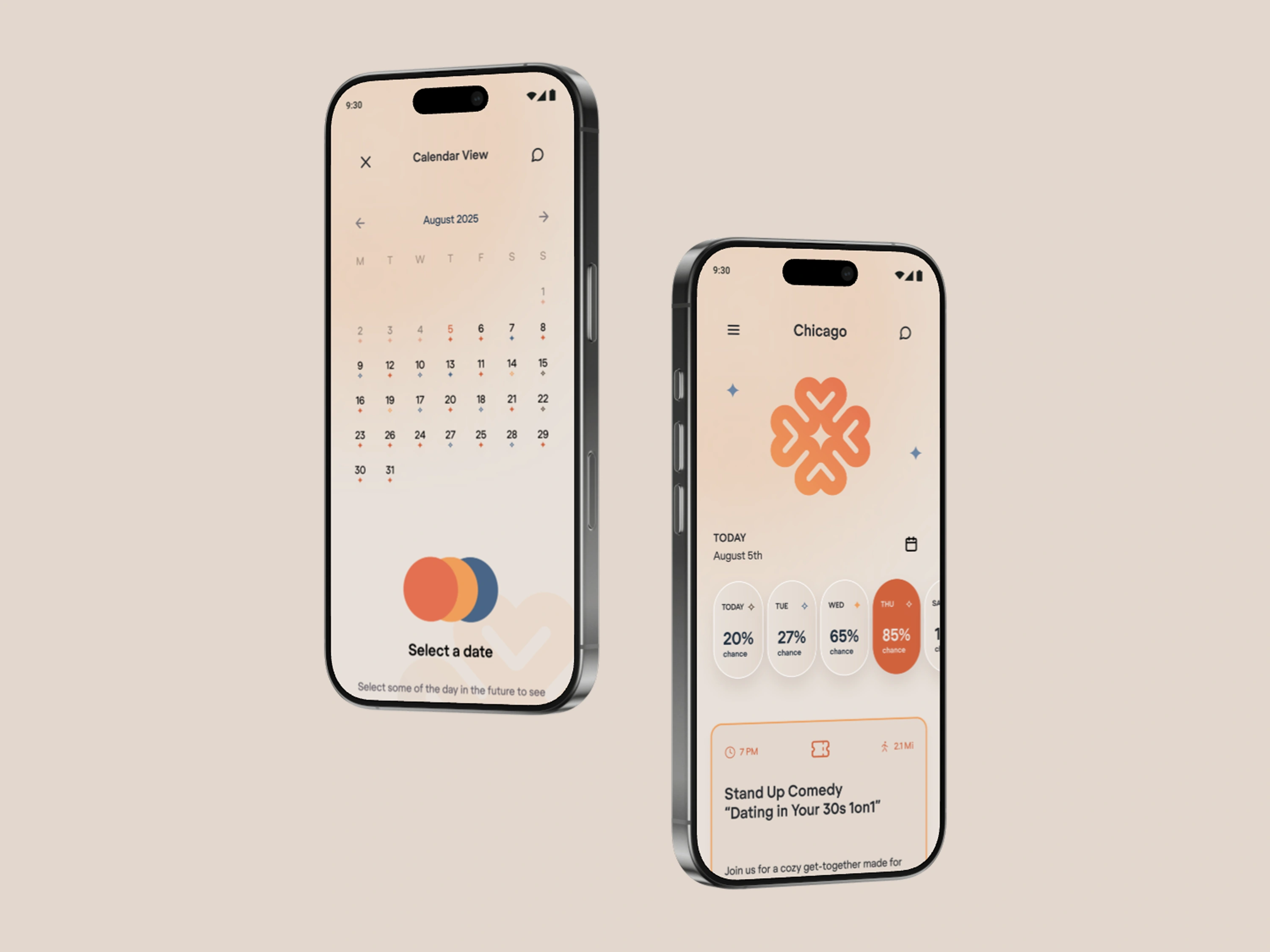 For the 2.0 version, I translated branding colors into a visual system that shows users their chances of meeting someone compatible, using interactive stars and a calendar for safe, real-world connections.