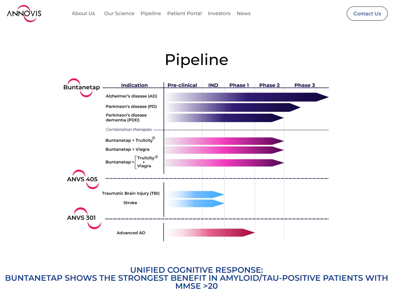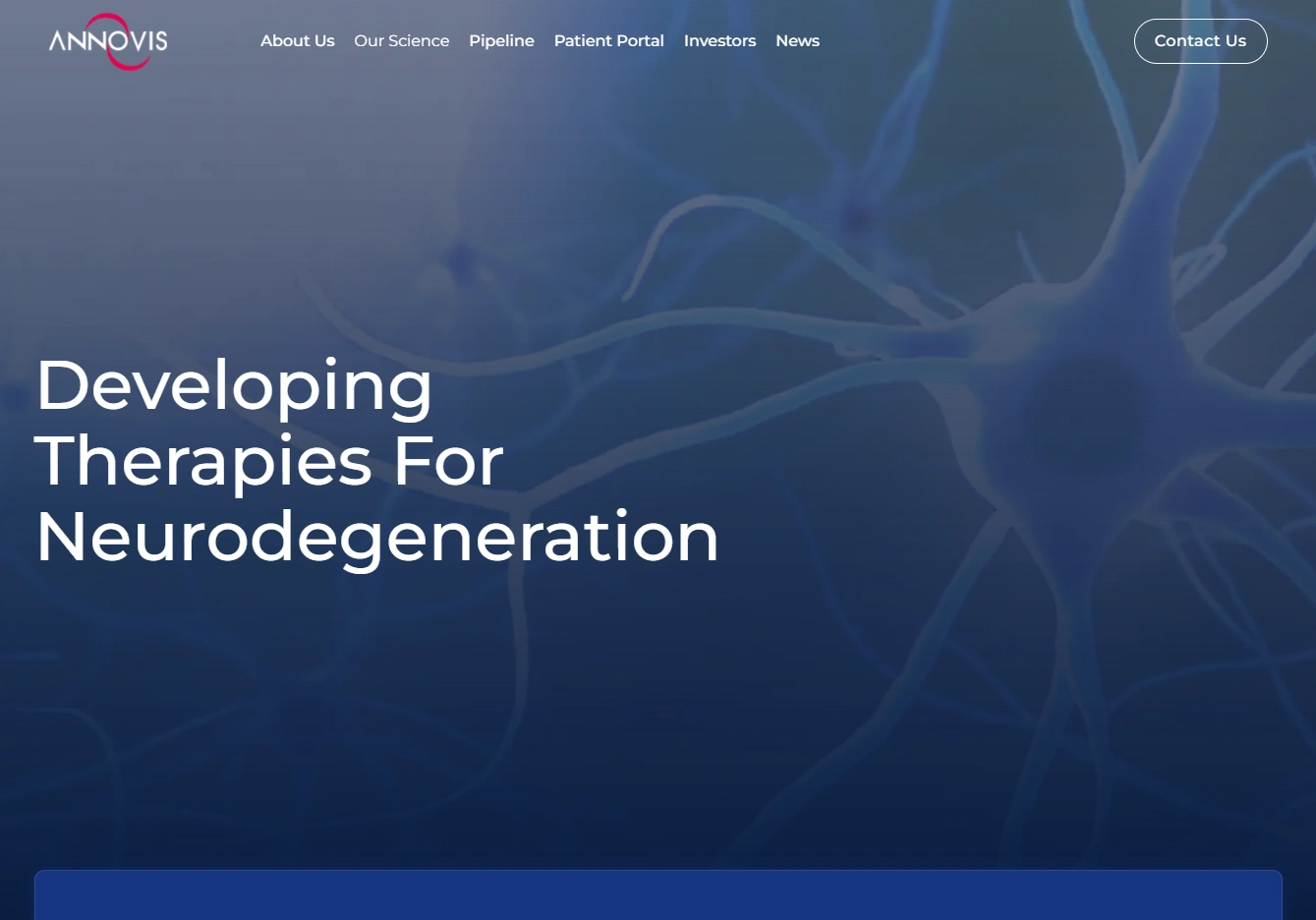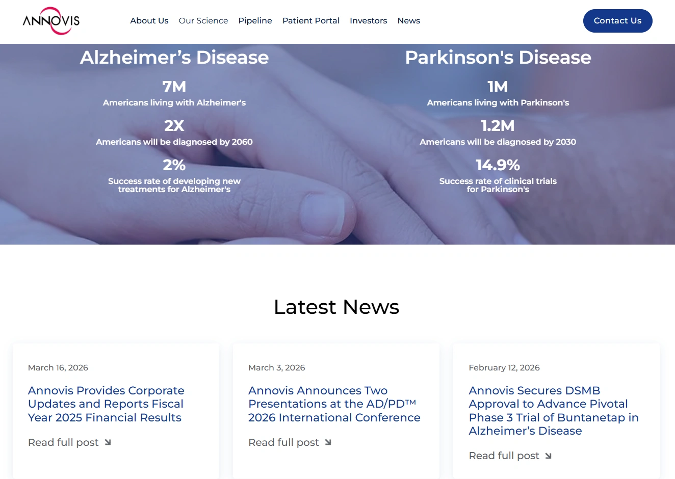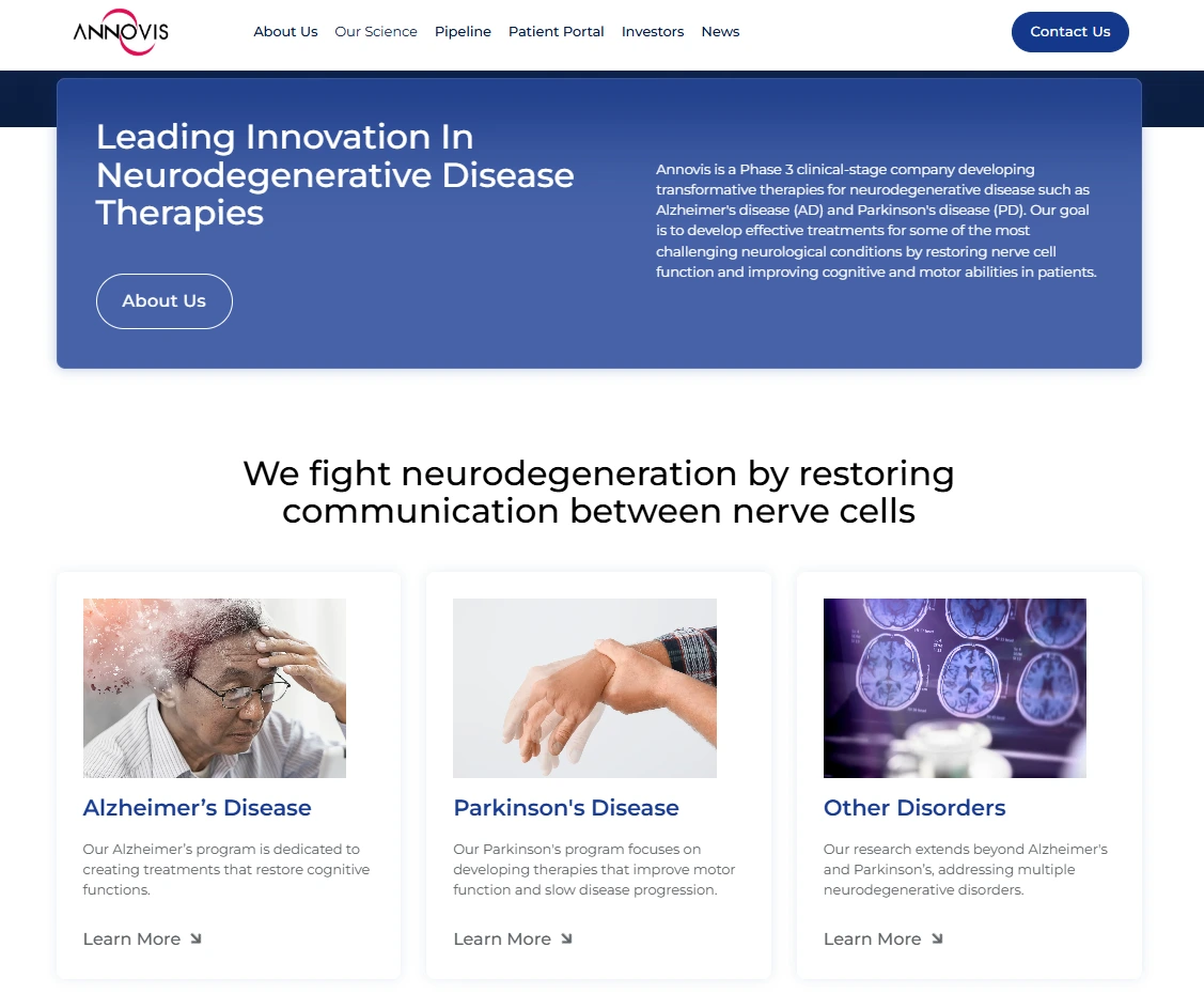 Webflow build for Annovis Bio, a Phase 3 clinical‑stage biotech developing therapies for Alzheimer’s (AD) and Parkinson’s (PD). The site communicates the mission—restoring nerve cell communication to improve cognitive and motor function—and organizes content for patients, clinicians, and investors: Our Science, Pipeline, Clinical Studies, and Investor Relations with timely news and SEC resources.