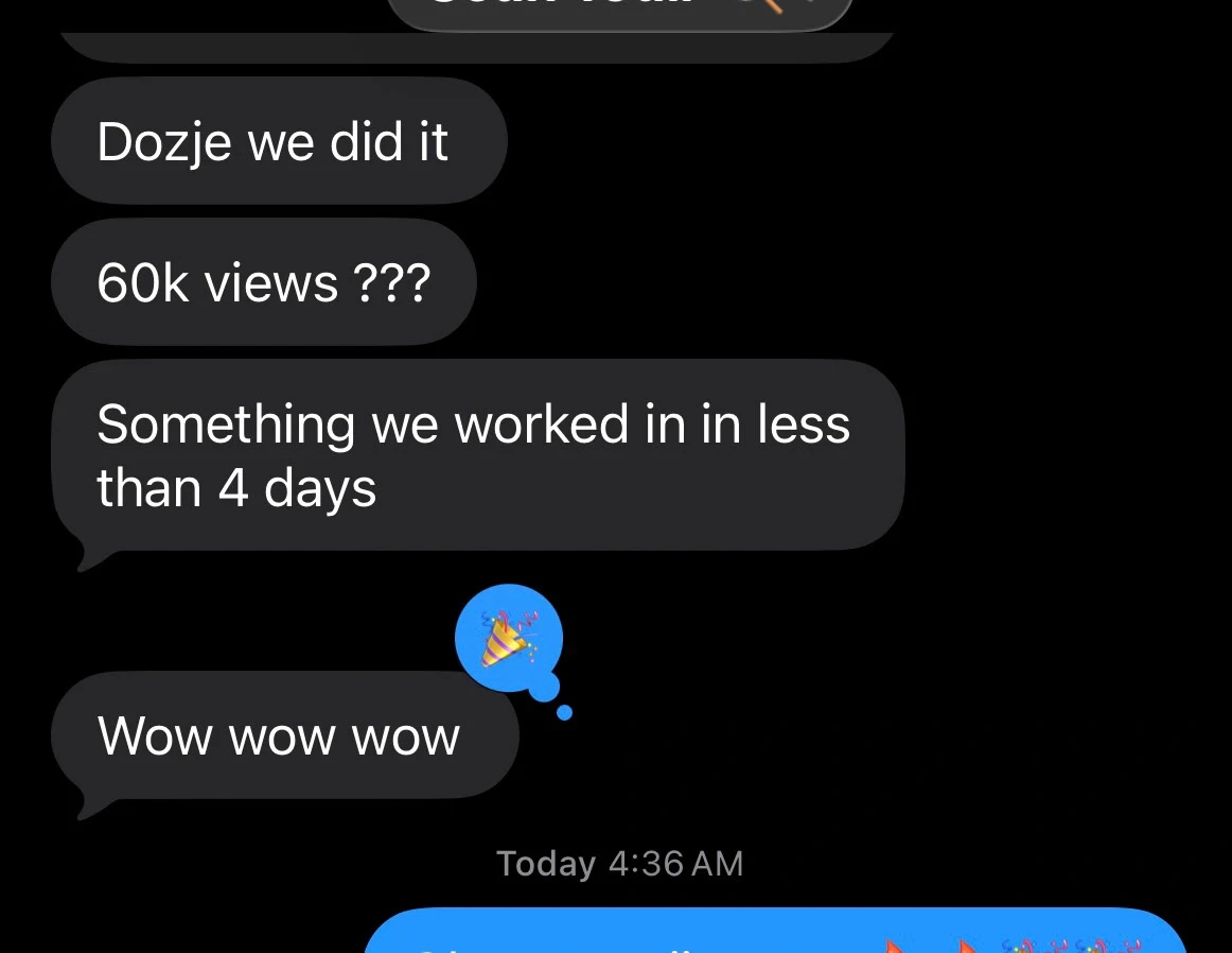 Client message showing launch performance within 24 hours 🎉