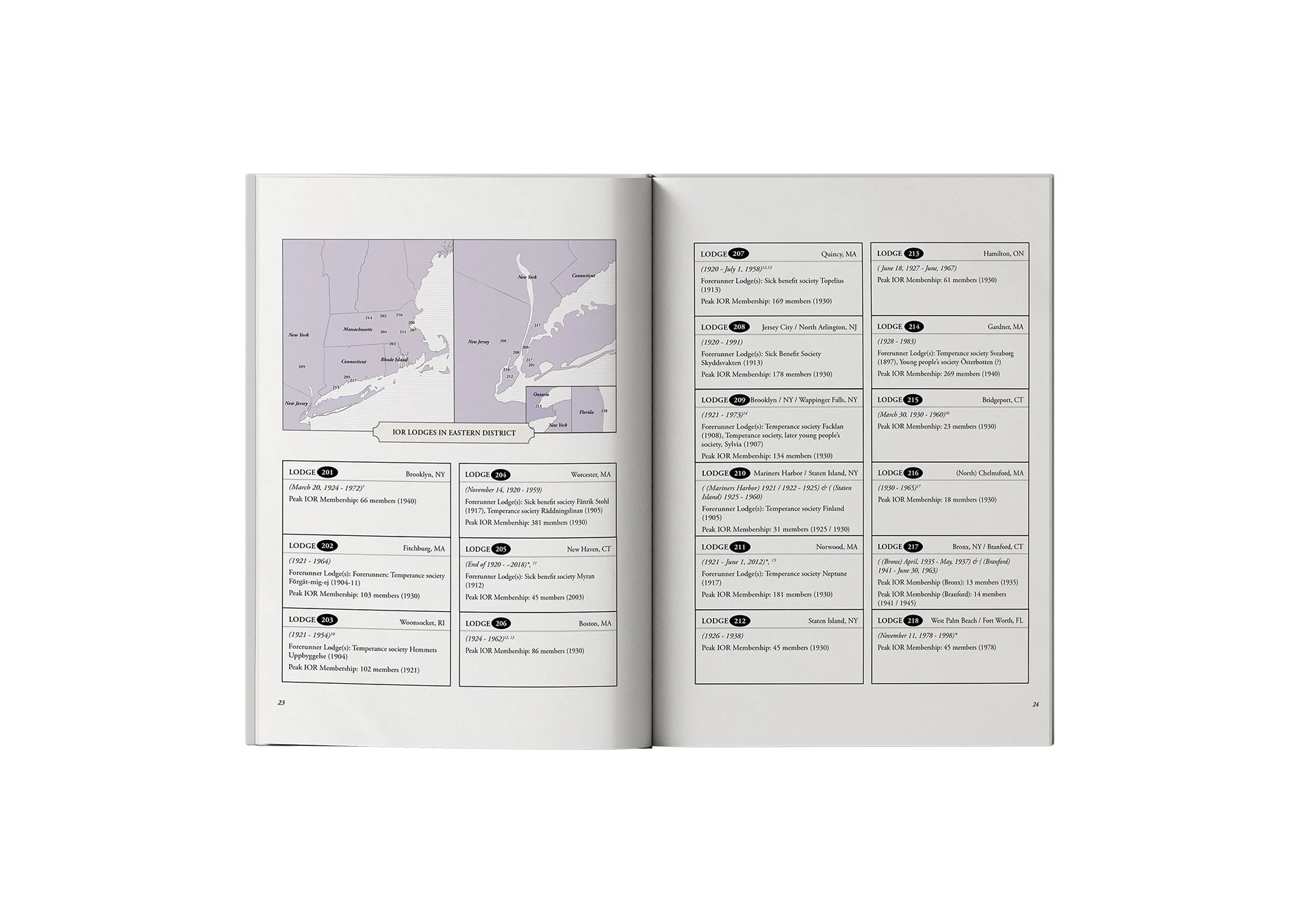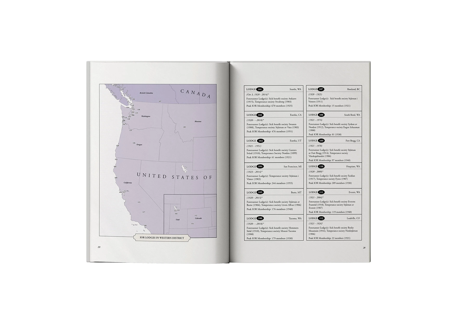Previous aesthetic of Swedish-speaking regions of Finland applied to maps showing distribution of International Order of Runeberg lodges (1920-1992) across North America