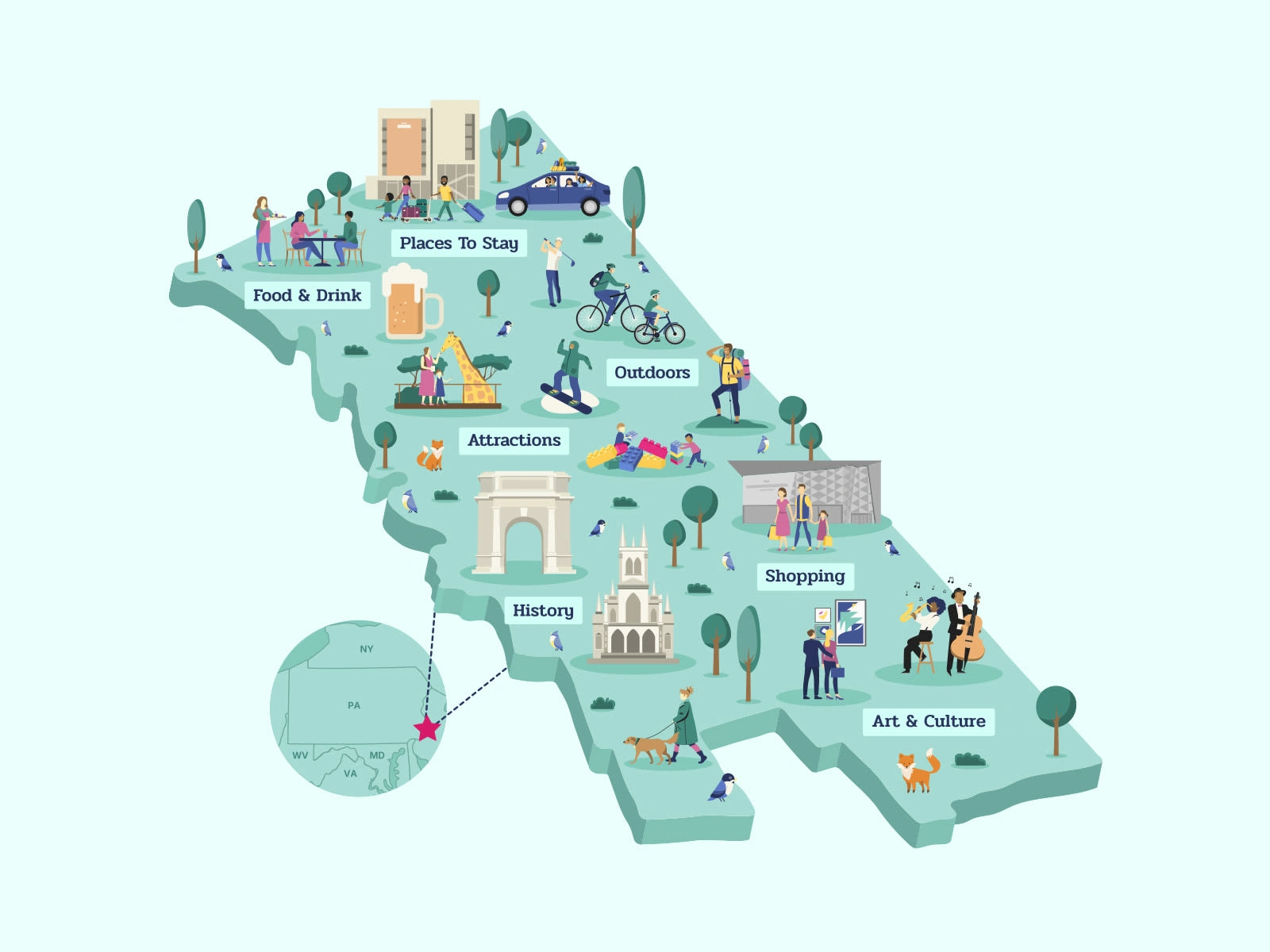 The goal of this map was to showcase a variety of attractions, activities, and points of interest throughout the county. It was designed to help visitors easily discover things to see and do - whether exploring local landmarks, enjoying outdoor adventures, or experiencing the area’s cultural highlights. The final illustration was featured on their website, printed materials, and even used in a
