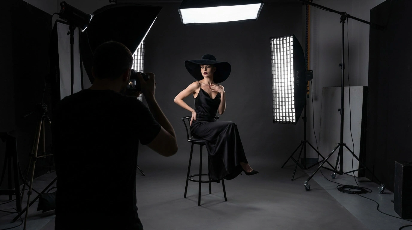 The scene follows a structured flow — from product handling to directed photoshoot — where every movement respects real-world behavior.