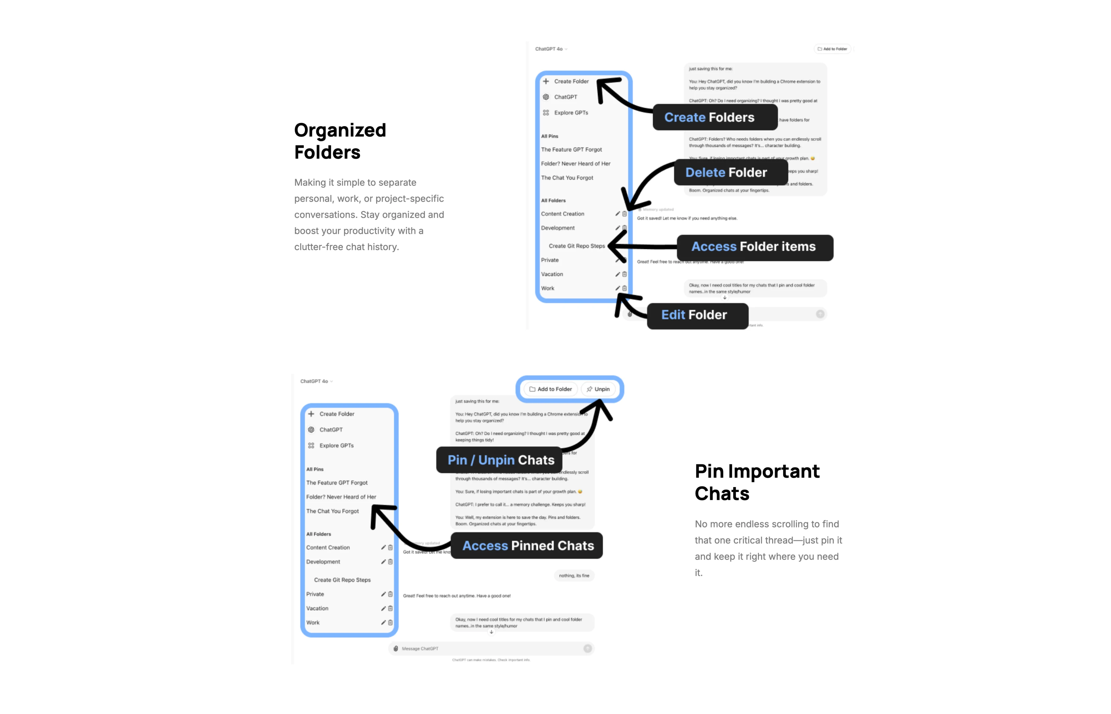 Chrome Extension that seemslessly integrates with the ChatGPT UI to help you organize your conversations with pins and folders