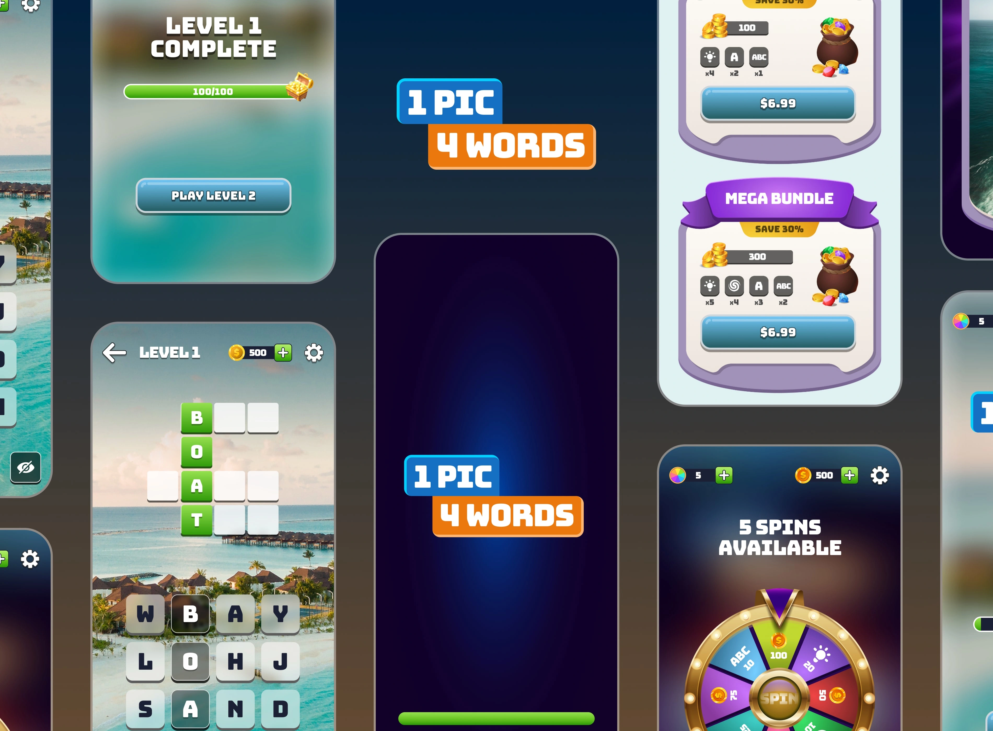 Players are presented with a photo and must find four specific words related to the picture. The words are constructed using a 4 by 4 grid of letters. The words could be nouns, adjectives, or even verbs describing the picture. As players progress through levels, the words become harder to find.