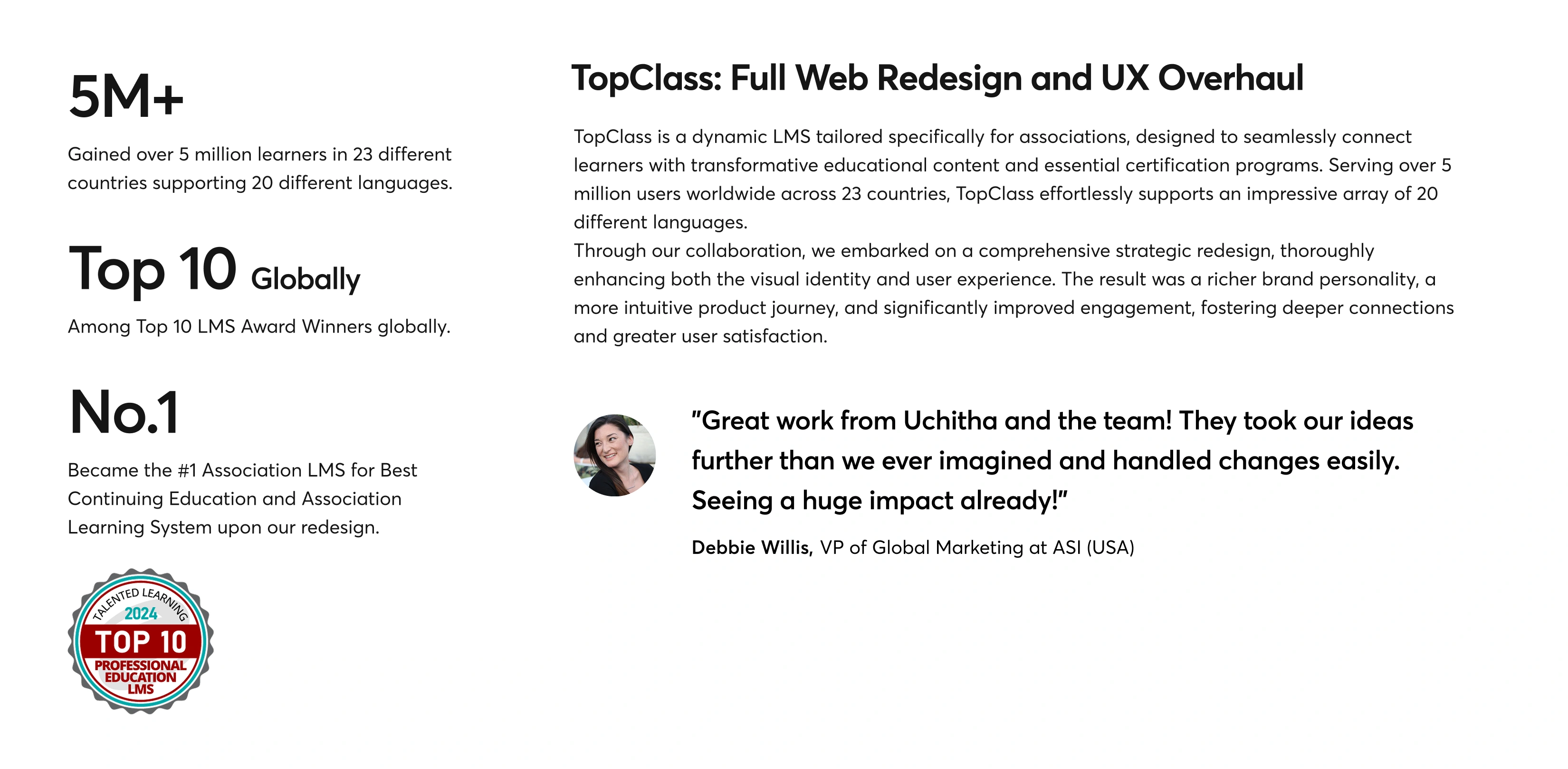 TopClass is a dynamic LMS tailored specifically for associations, designed to seamlessly connect learners with transformative educational content and essential certification programs. Serving over 5 million users worldwide across 23 countries, TopClass effortlessly supports an impressive array of 20 different languages.