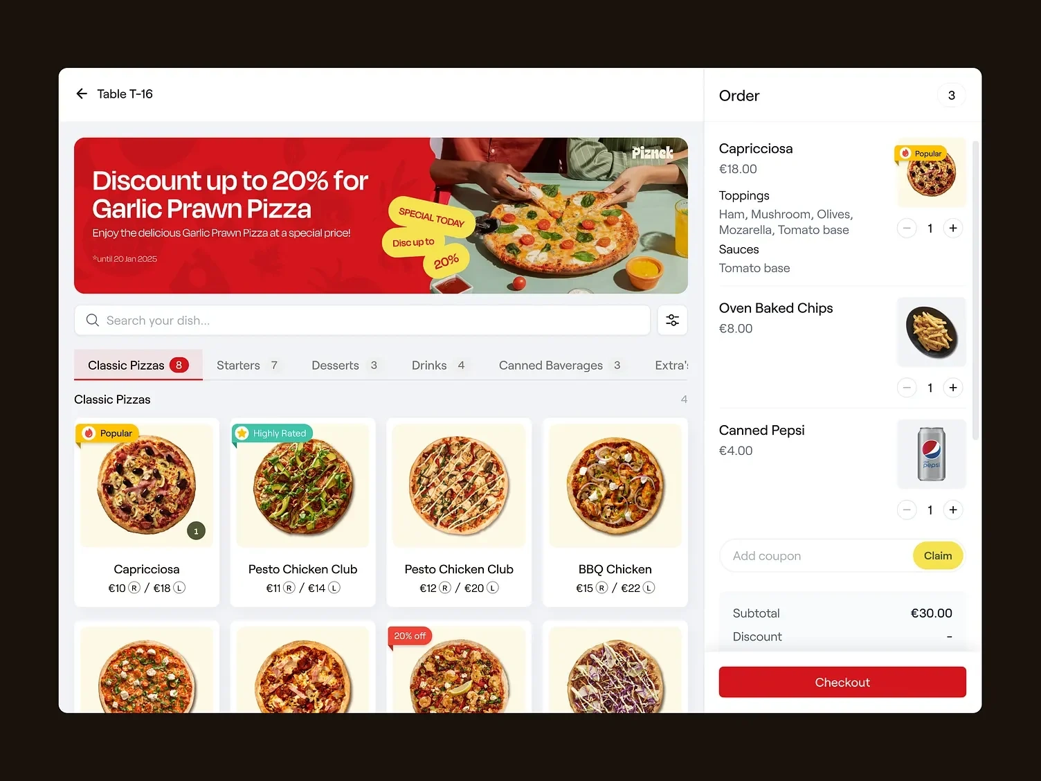 Visual exploration of Piznek’s restaurant POS system, focusing on intuitive navigation, simplified ordering, and efficient transaction flow