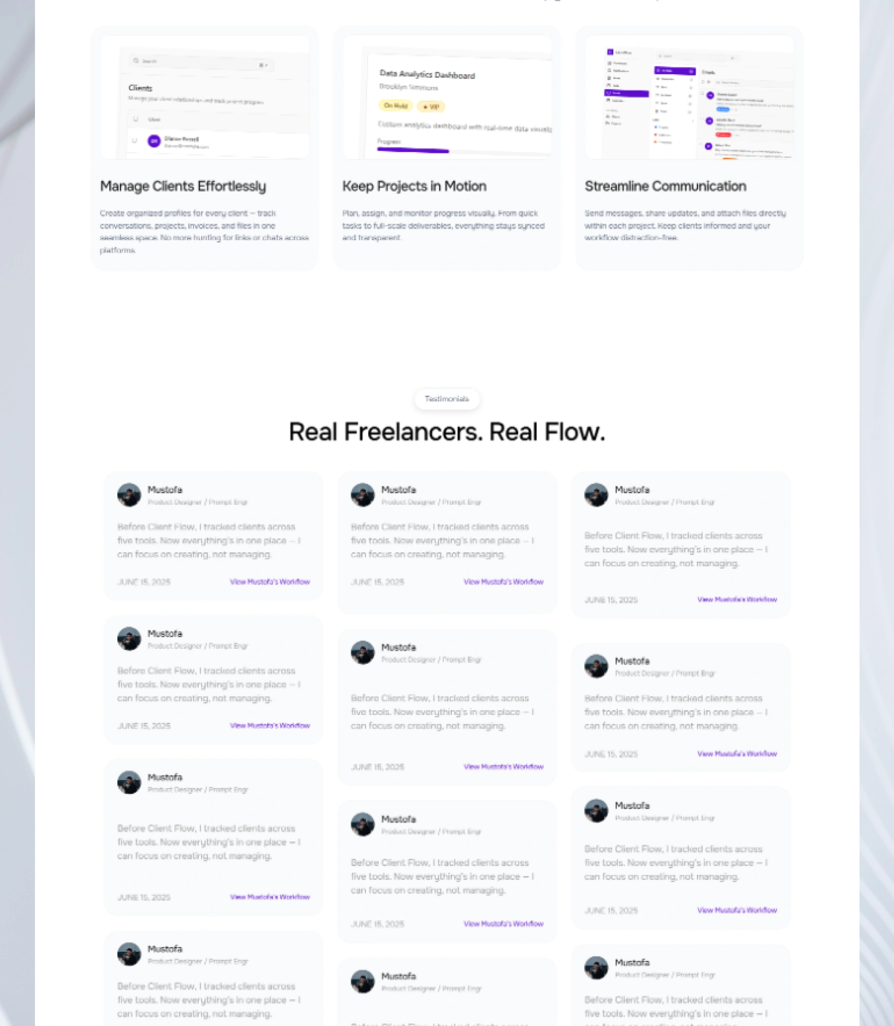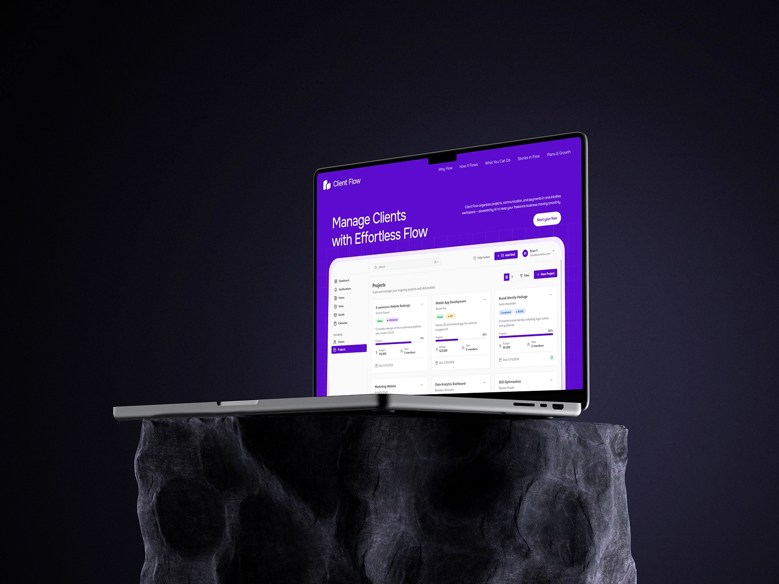 Client Flow is an AI-integrated workspace concept for freelancers. My role was to take the design concept and build a fully responsive, SEO-optimized landing page using Framer. I focused on translating the brand’s "effortless" identity into a seamless web experience with smooth transitions and high-performance layouts.