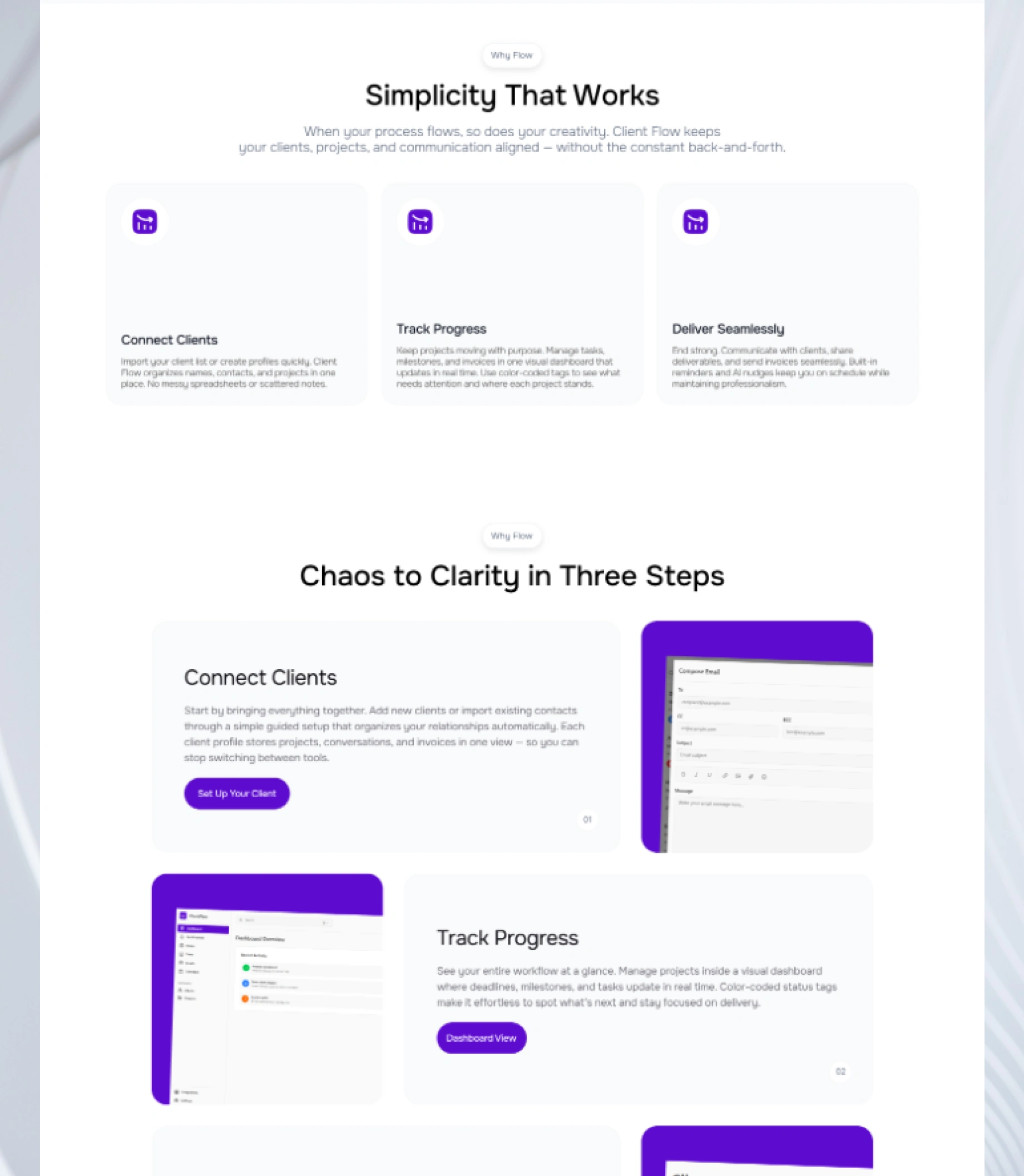 Client Flow is a workspace concept for freelancers. My role was to take the design concept and build a fully responsive, and SEO-optimized landing page .
