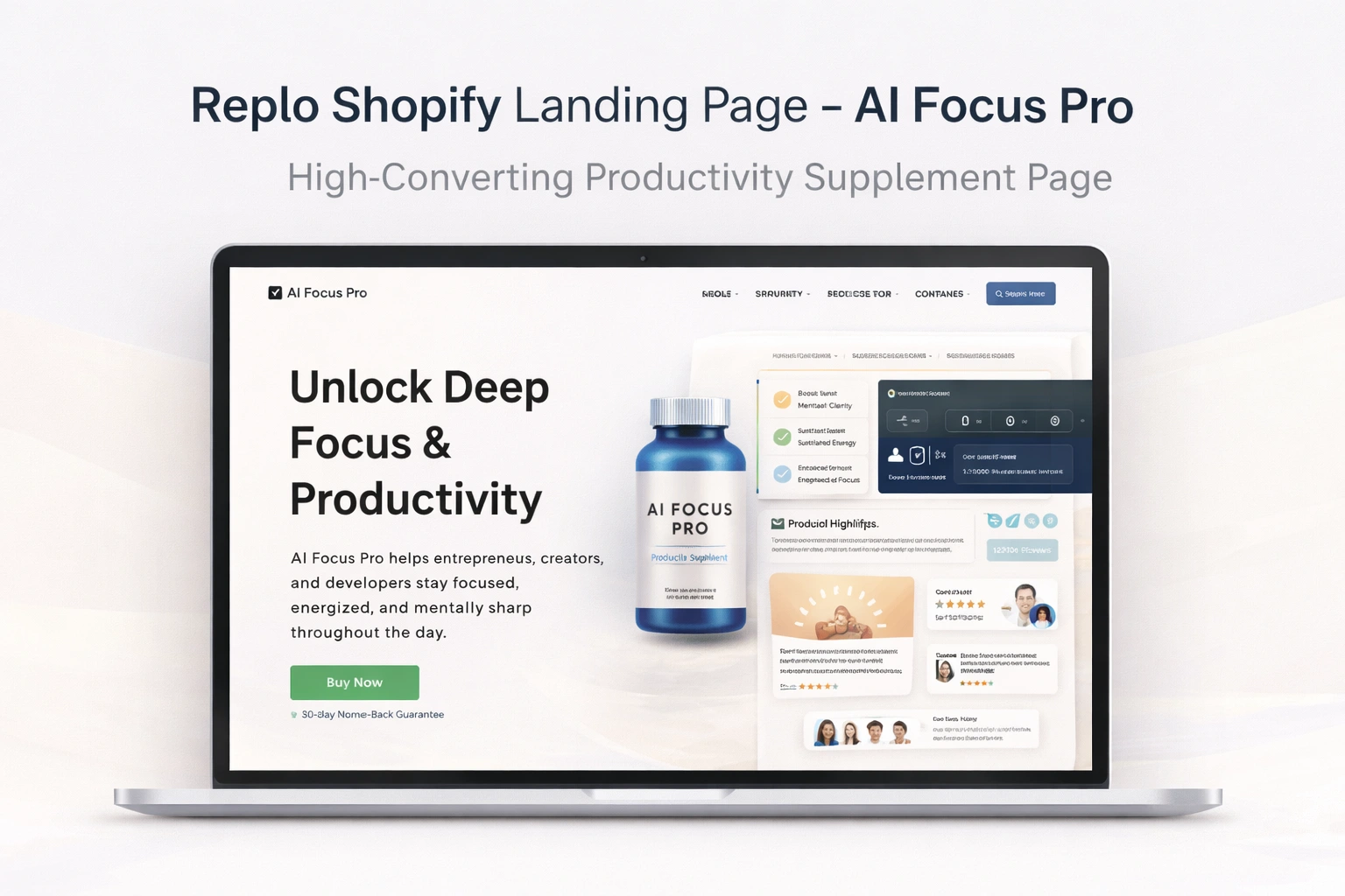 Built a Shopify landing page in Replo with product sections, trust signals, and strong CTAs designed to improve ecommerce conversion and user engagement.