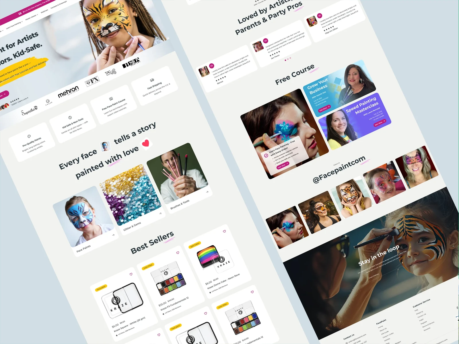A clean, vibrant homepage design created for FacePaint, a brand focused on selling high-quality face paint products. The layout emphasizes bold product visuals, easy navigation, and clear call-to-actions to drive conversions. With a playful yet professional aesthetic, the site highlights bestsellers, skin-safe ingredients, and customer favorites — all optimized for a smooth shopping experience across devices.