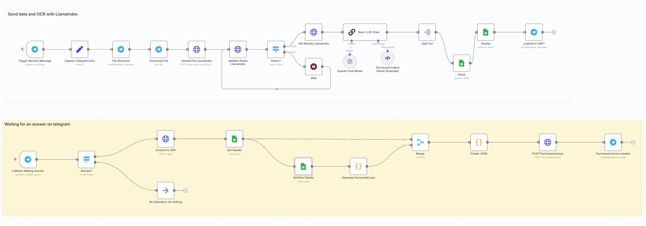 This n8n workflow automates invoice handling from Telegram. When a user sends a PDF, it’s processed via LlamaIndex OCR, parsed with an LLM (LangChain), and structured into JSON. The data is logged in Google Sheets and—if approved via Telegram—sent to SAP Business One through the Service Layer API. Includes header/line item splitting, confirmation prompts, and SAP integration for seamless invoice creation.