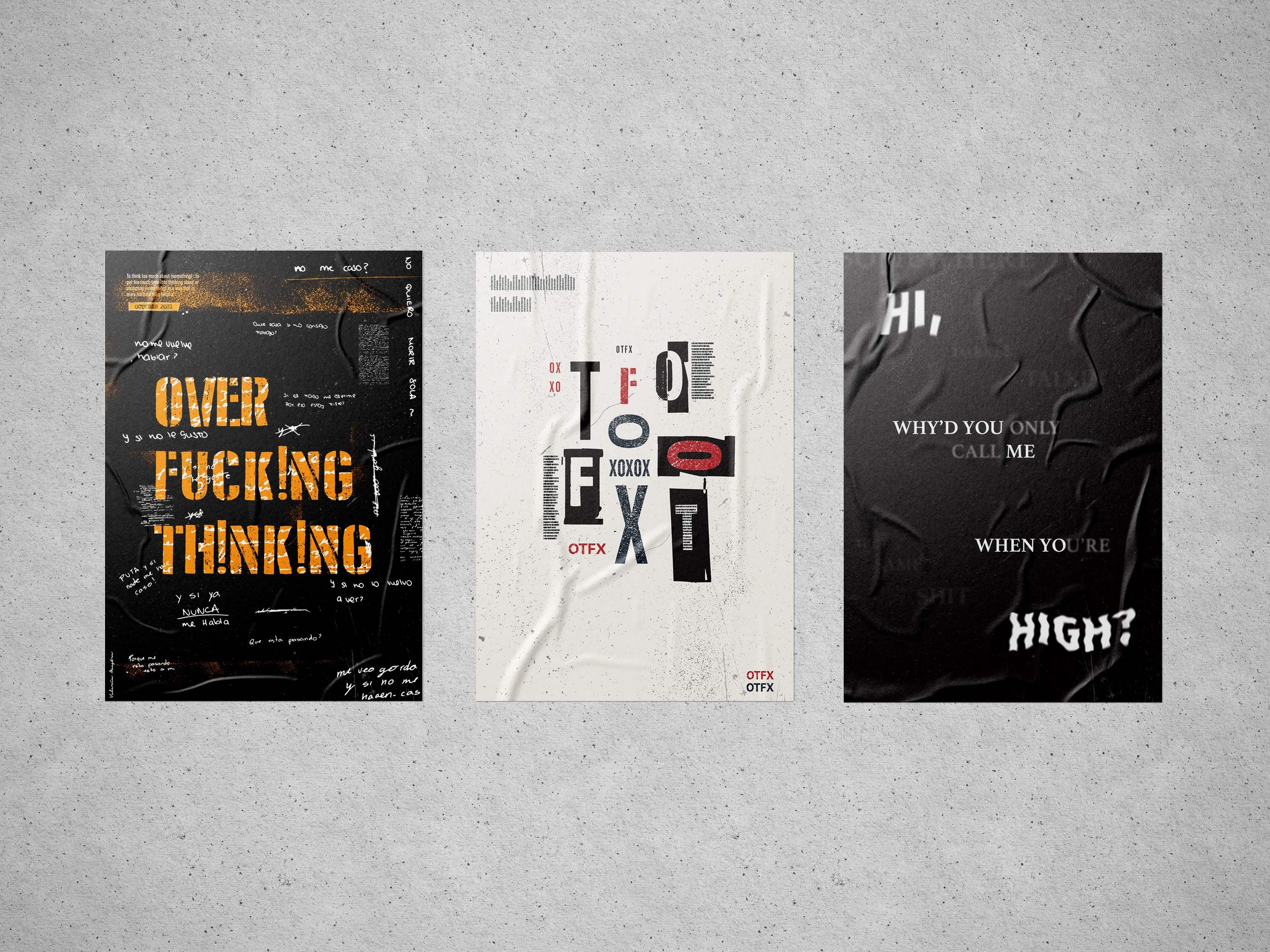 A series of posters exploring the power of typography. Each piece is driven by a theme—emotion "How I Feel", a personal brand "OTFX", and music "Song Lyrics".