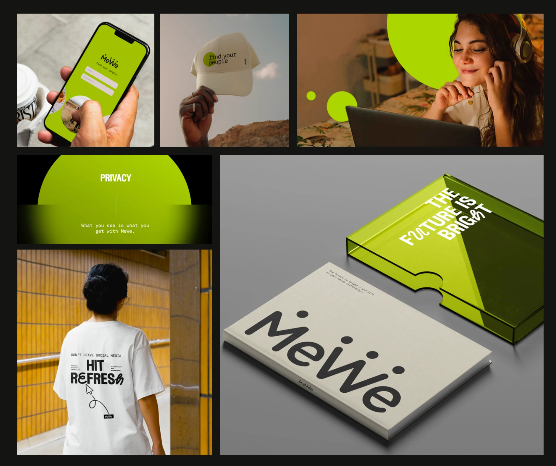 The visual brand for MeWe centers around a vibrant lime green, chosen to stand out in a crowded social media landscape. This single, bold color creates a unique, memorable identity and reinforces MeWe’s mission to bring people together in a space that’s fresh, welcoming, and different from the typical social experience.