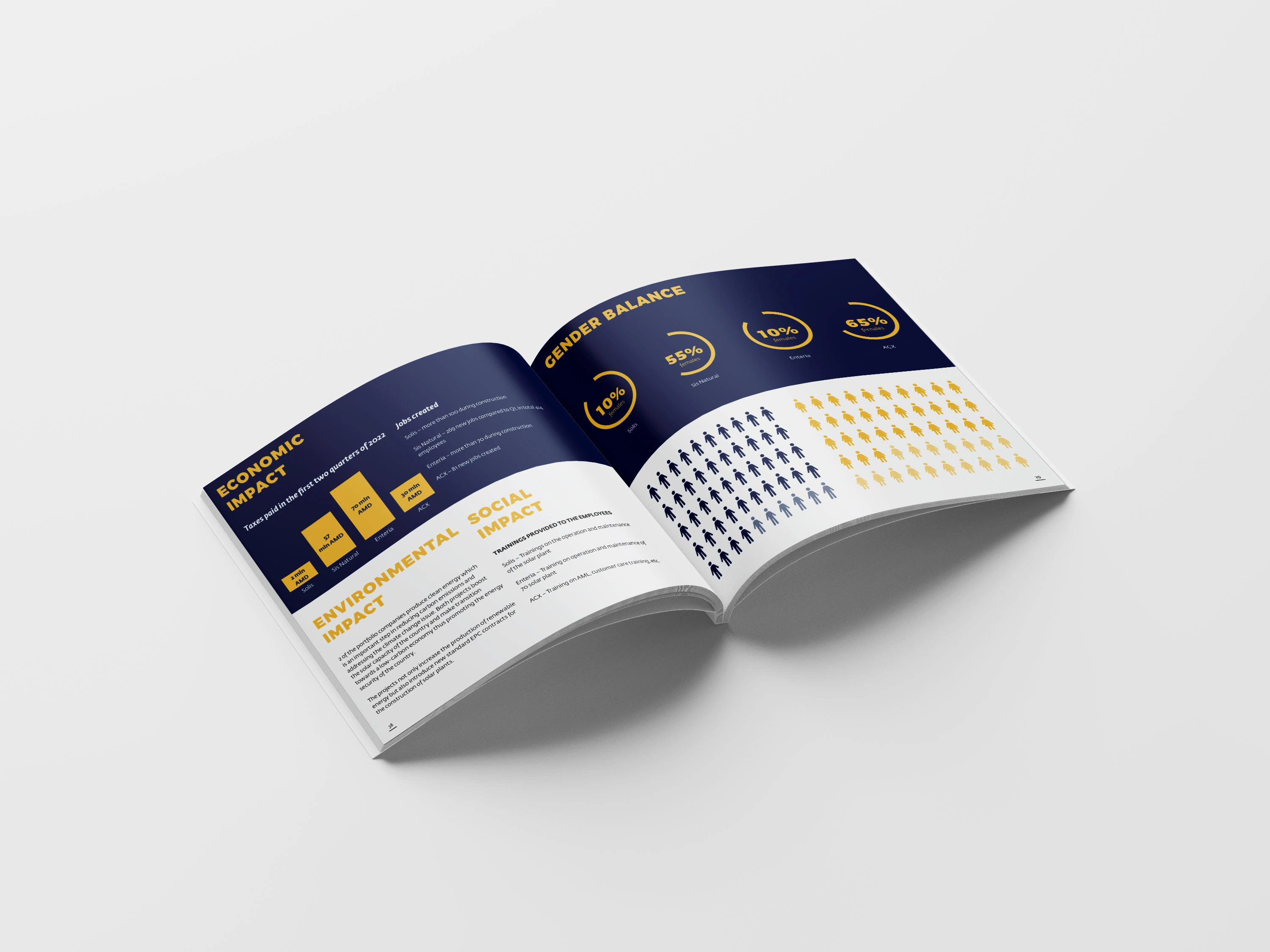 Comprehensive annual report design of over 100 pages, featuring a clear layout, custom infographics, illustrations, and data-driven diagrams to present complex information in a visually engaging and accessible way.