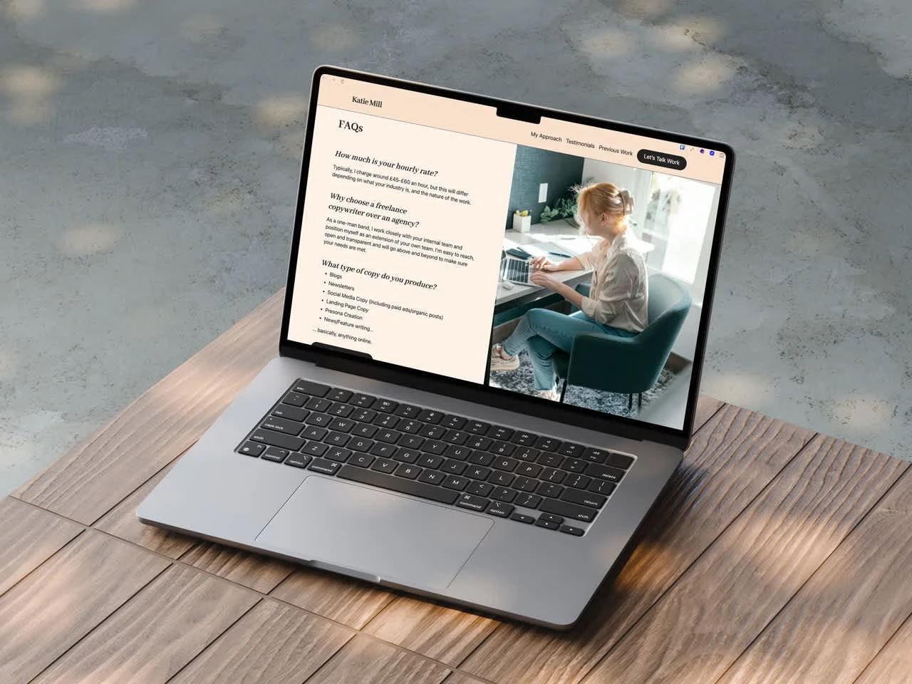 Katie wanted a site for her business as a solo-copywriter for freelance or white-labelling work. This would feature a grid-heavy design, focal points on text, and appealing warm colours to evoke the right mood for her business.
