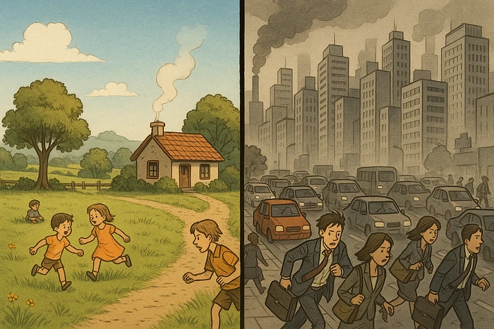 The city is a place of glowing lights, towering buildings, never-sleeping roads, a stage to showcase ambition and strength, offering endless opportunities. But behind its dazzling skyline, there is a hollow feeling, a realization that, for many like me, the city is not a true home. My home is where life unfolds slowly, where seasons guide our days, neighbors are family, and the earth itself feels alive. That place is the village. City is a place where I came to survive, to work, to earn.