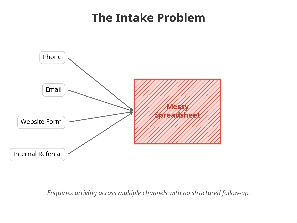 Redesigned a law firm’s enquiry intake system, replacing spreadsheet tracking with structured workflow and automation. Conversion improved from ~25% to ~45%.