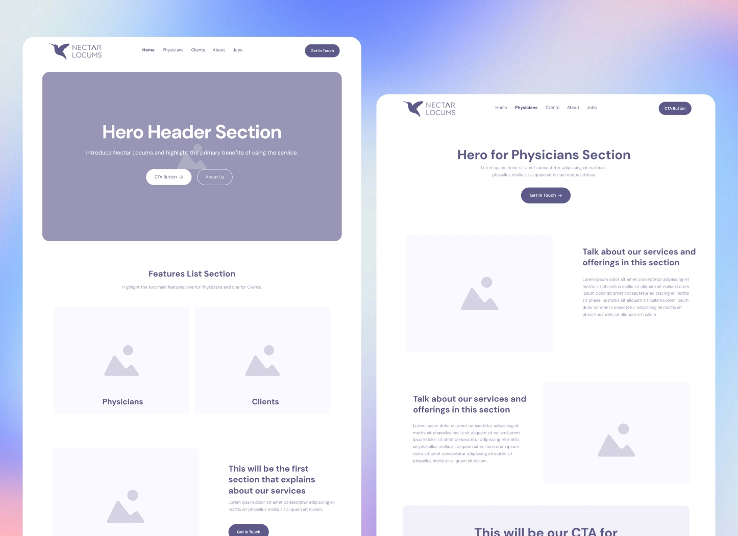 With the wireframes validated, I designed the full Nectar Locums website using the established brand identity. The design aimed to feel professional, calm, and human, a break from the overly clinical look common in healthcare sites.