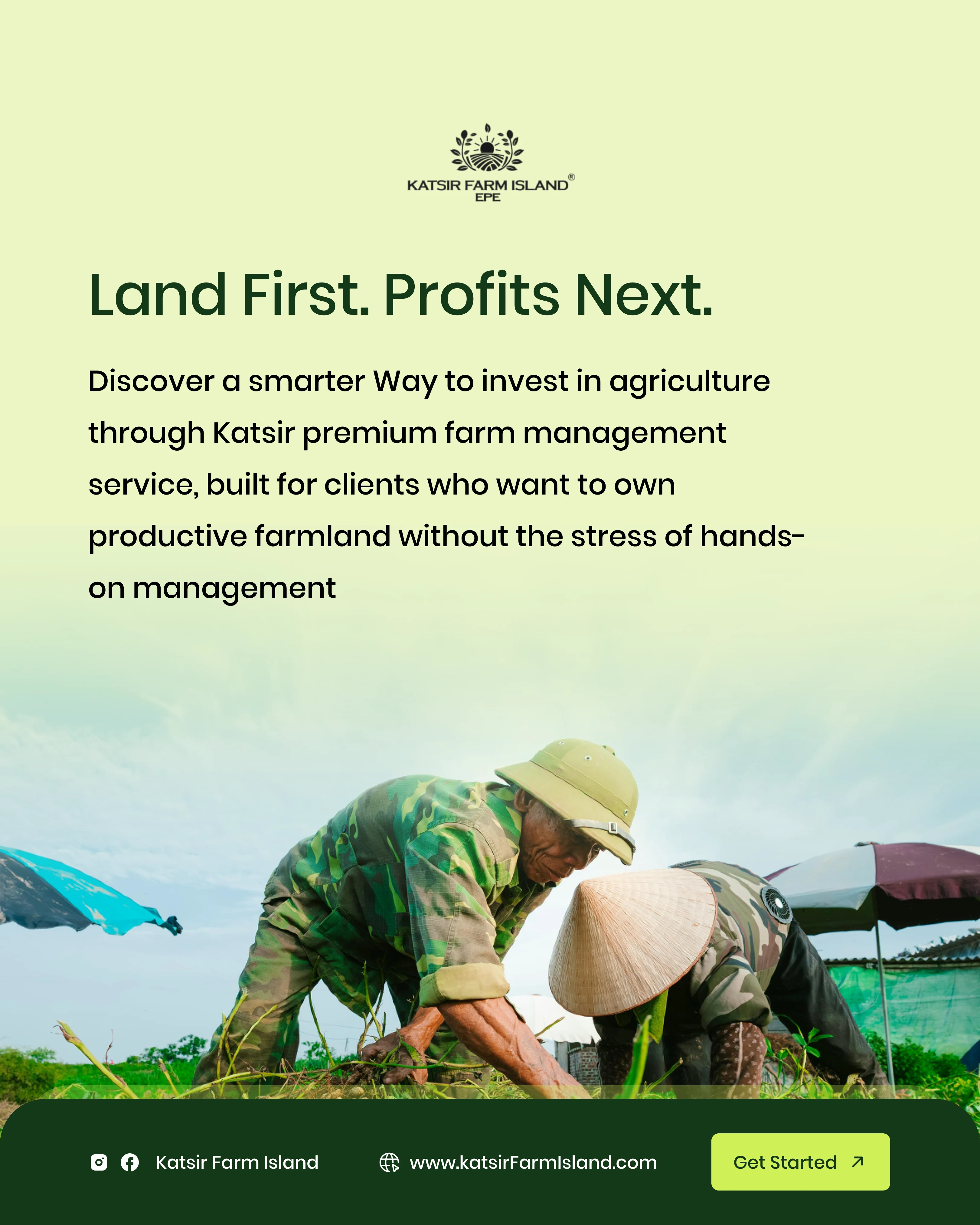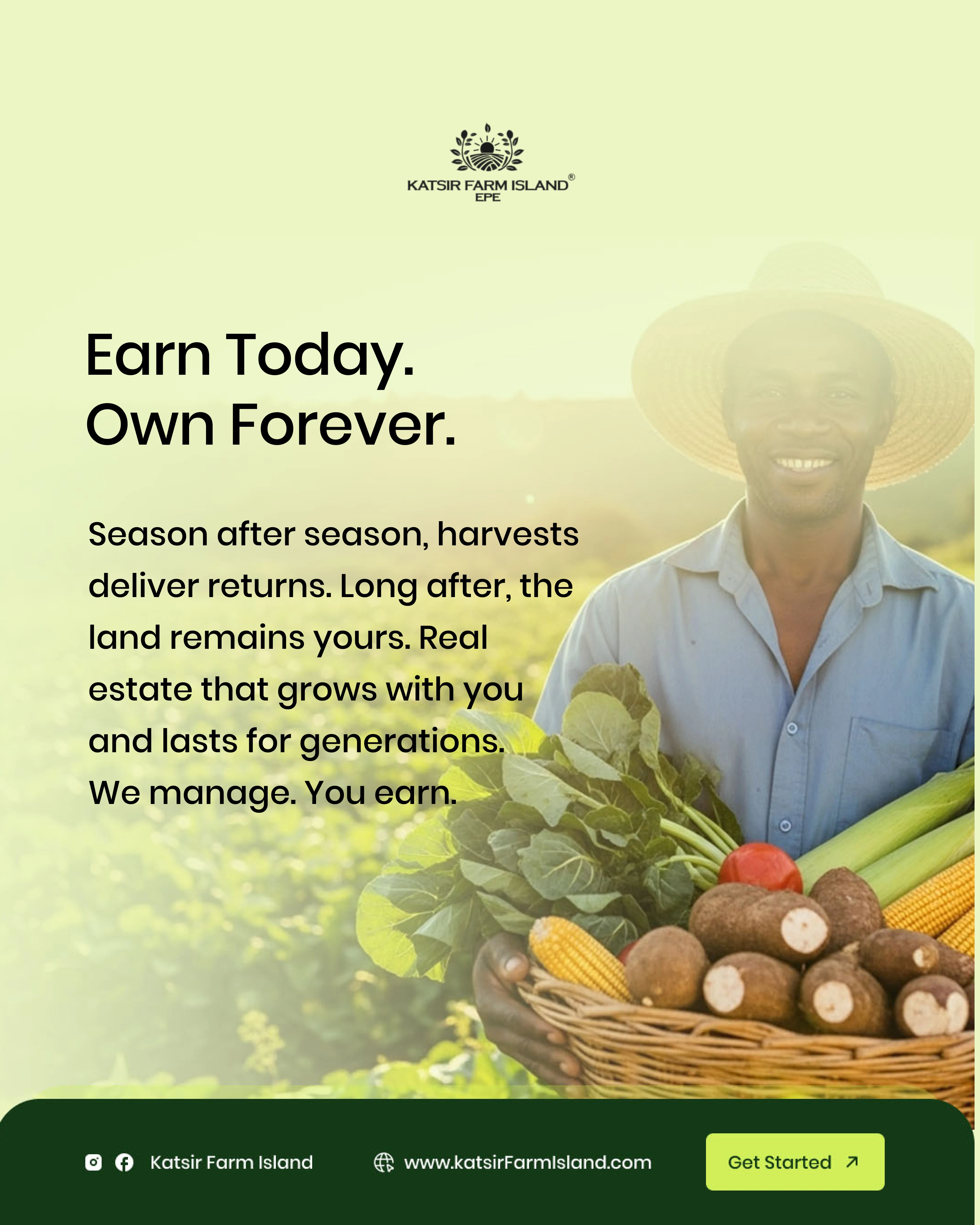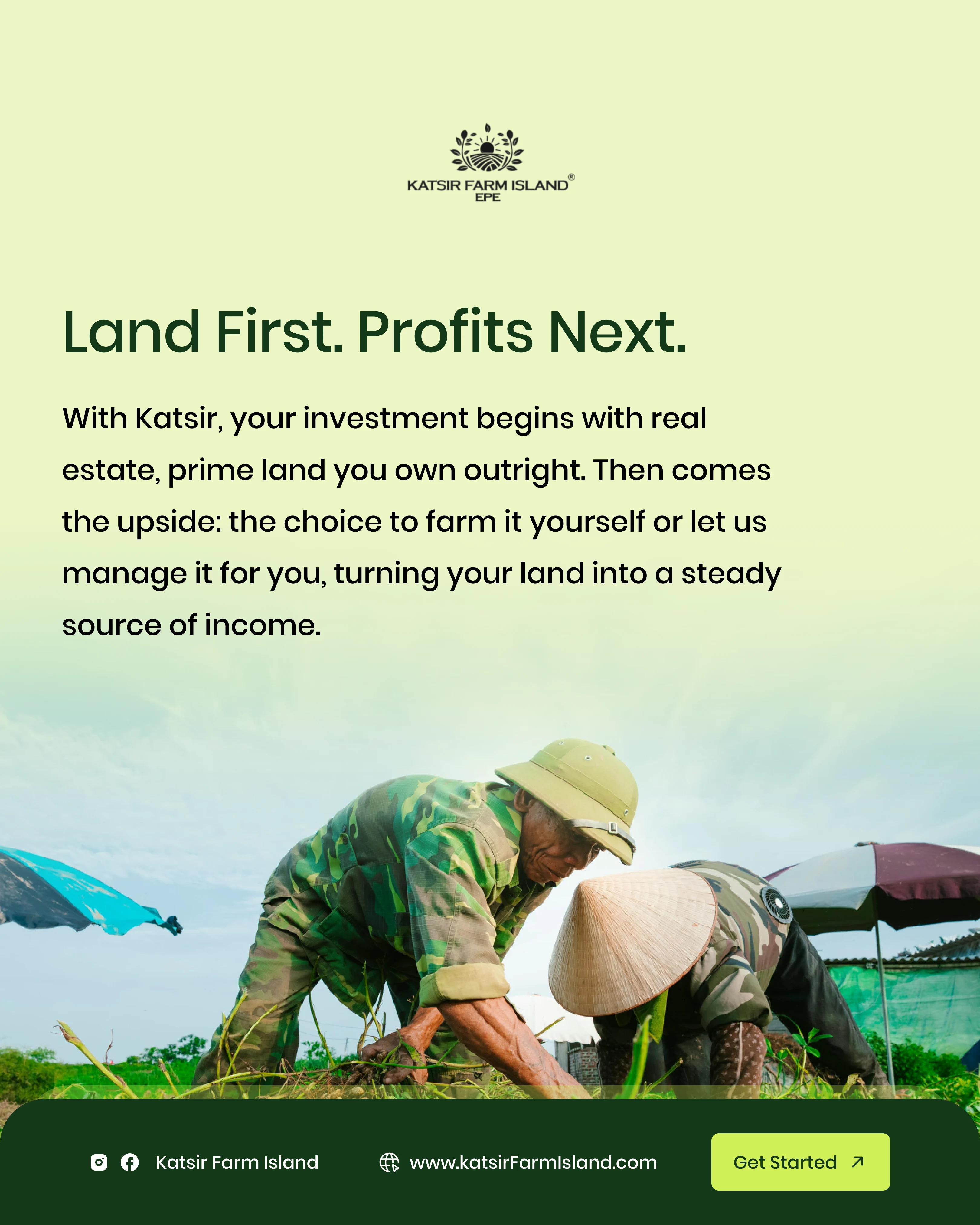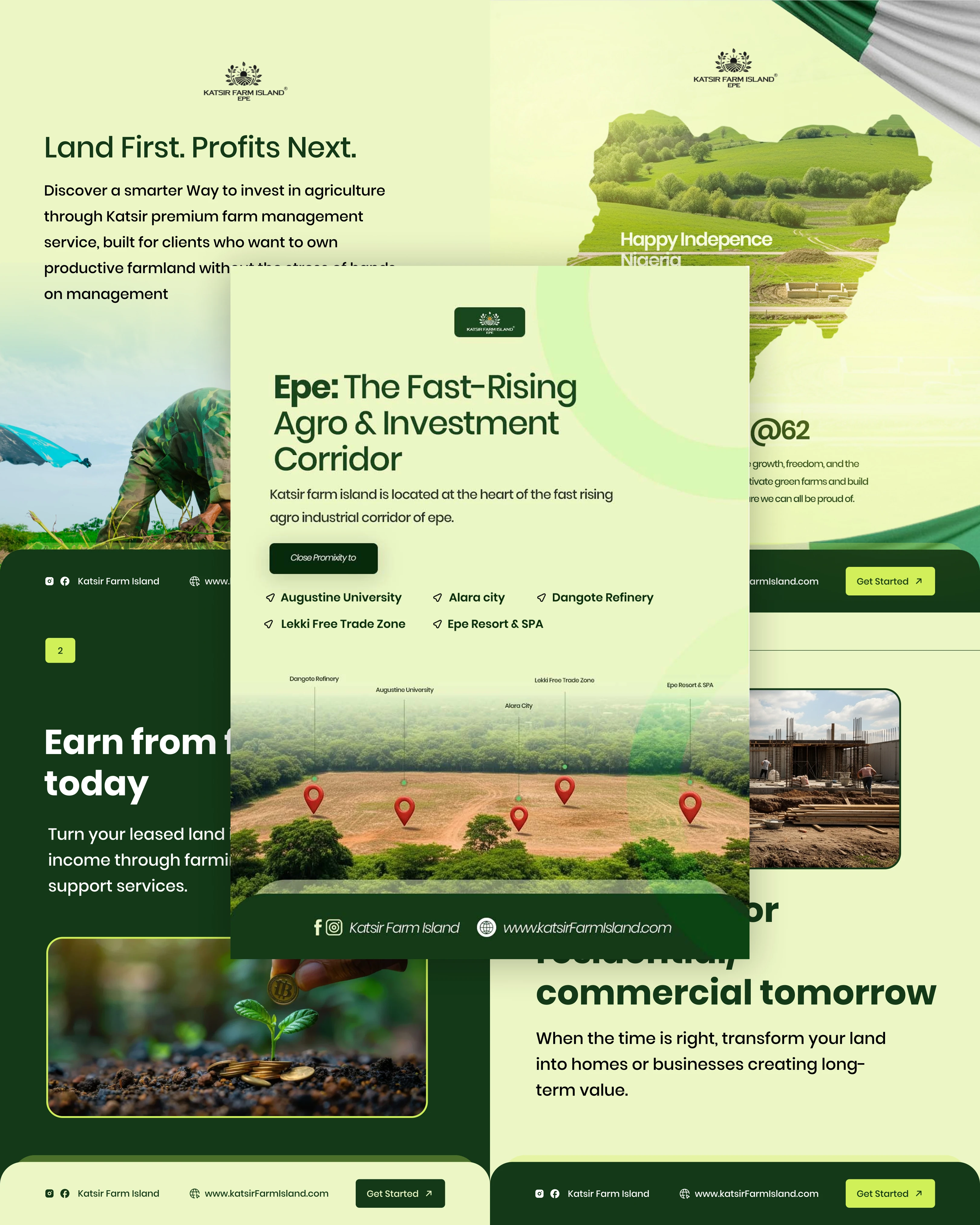 Project Description: Katsiri Farm Island - Investment & Lead Generation The Client: Katsiri Farm Island, a premium service offering managed agricultural land investment with a focus on future commercial transformation. The Goal: To design compelling digital assets to generate high-quality investor leads by clearly communicating the dual benefits of immediate agricultural income and long-term capital growth. My Solution (Creative Strategy): Trust & Value: Used a clean, deep-green and white color palette to symbolize growth, stability, and professionalism, which is essential for investment products. Strategic Communication: Focused content on key financial drivers: "Land First. Profits Next." and "Epe: The Fast-Rising Investment Corridor." Data Visualization: Created clear, simple map graphics and proximity indicators to prove the land's strategic value near major developments (e.g., Dangote Refinery, Universities). Long-Term Vision: Designed assets showcasing the progression from