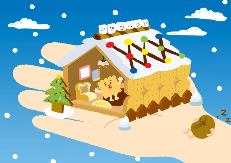 A digital illustration of sugar snow falling on a house of cute snacks on the palm of your hand.