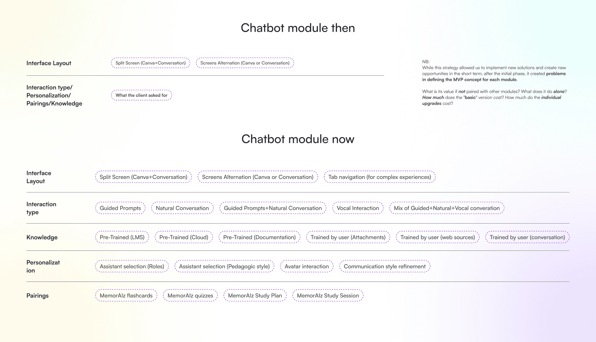 Many features of modules overlapped, and we were still defining how modules could be combined, what constituted the true MVP of each, and which additional configurations actually increased market value.