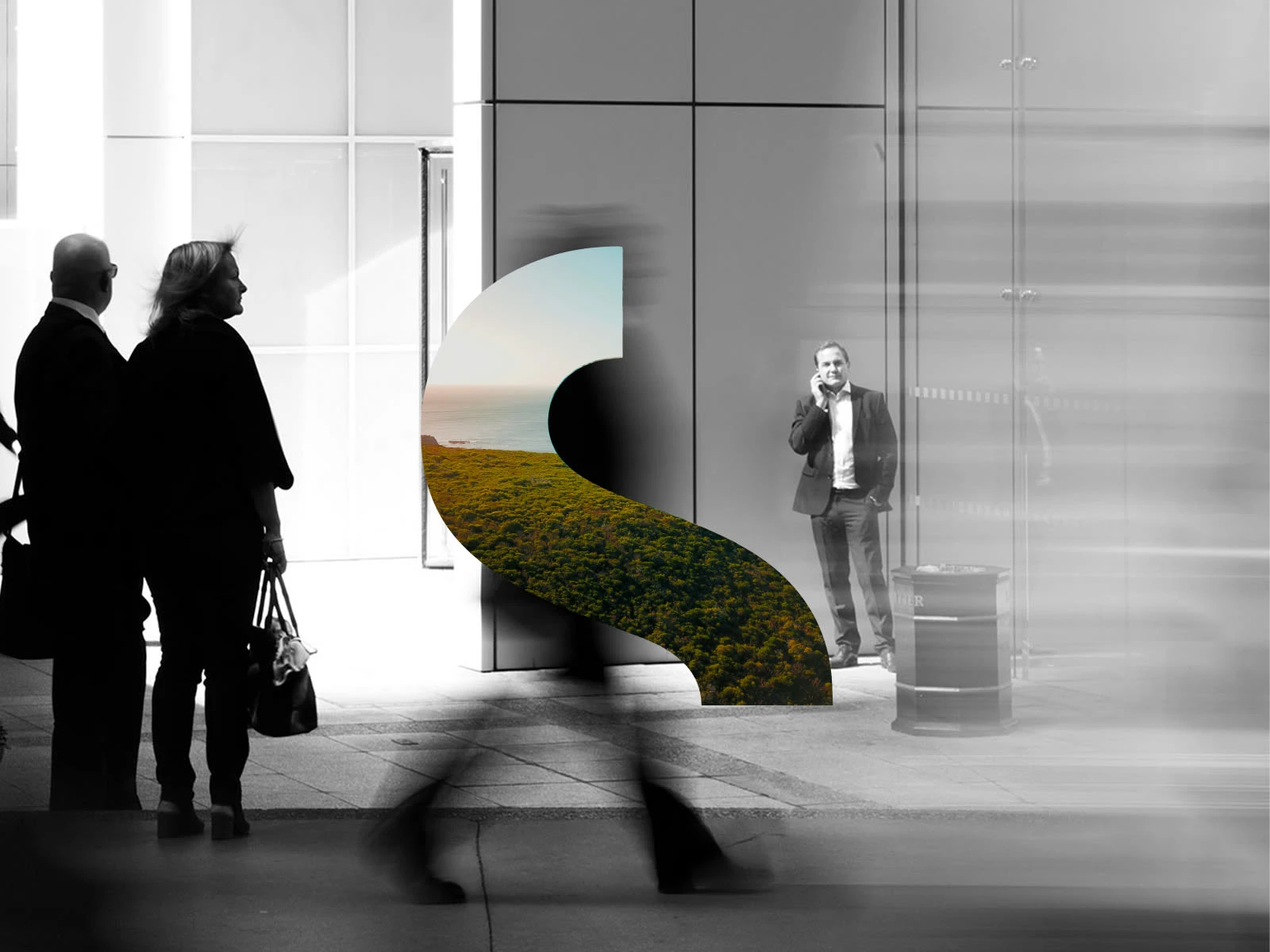 When colour imagery appears within the core element, background photography shifts to black and white. This contrast reinforces a sense of new direction, focusing attention on what is changing and moving forward.