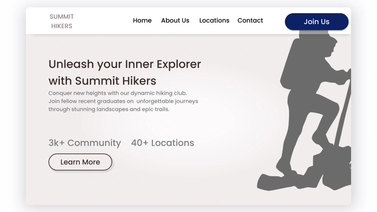 Clean hiking club hero section. Designed to build trust & emotionally resonate with adventure-loving users. Focused on community & drives action on first impact