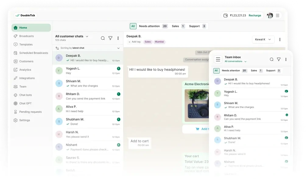 DoubleTick is a phone-based WhatsApp API for B2C & B2B sales. Do unlimited Bulk Whatsapp messaging, chatbots, end-to-end order booking, and more.