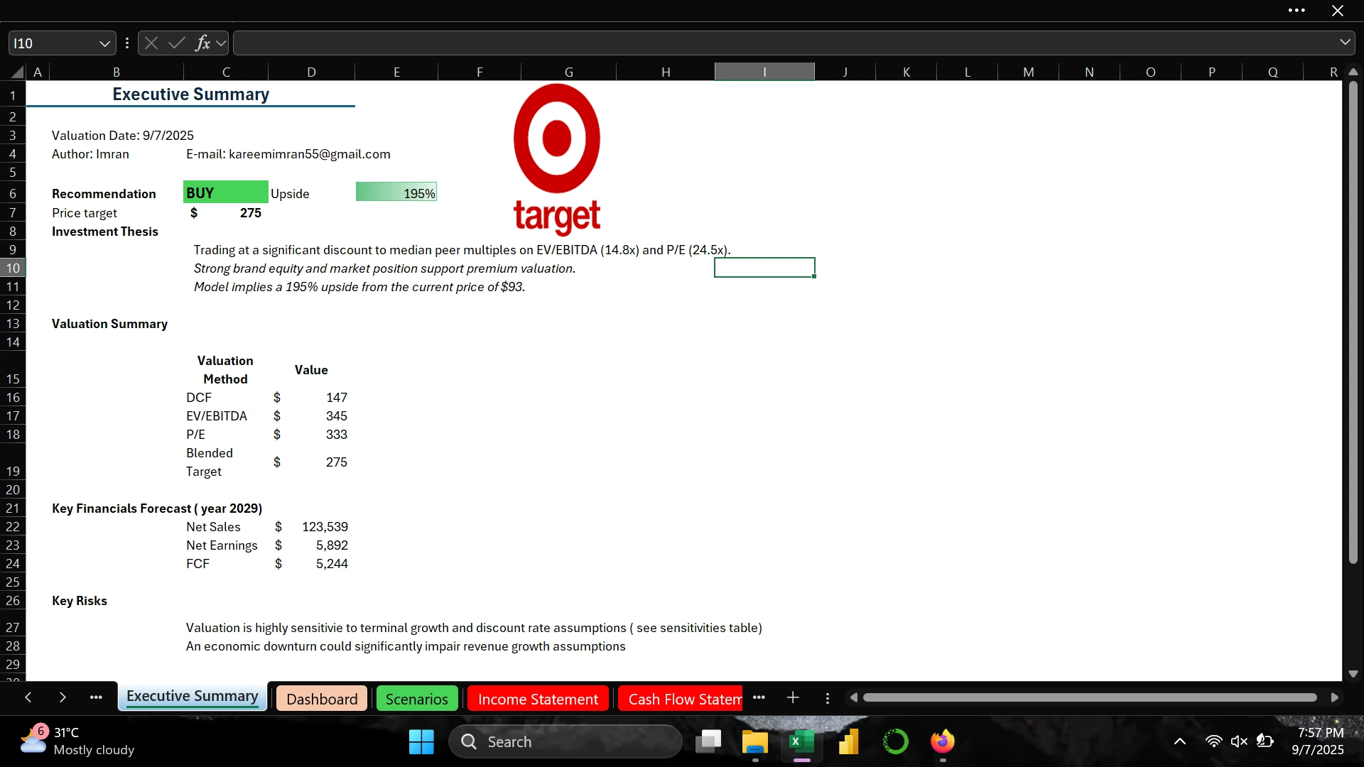 This project involved building a professional financial model to value Target Corp., culminating in a strong "BUY" recommendation with a significant upside.