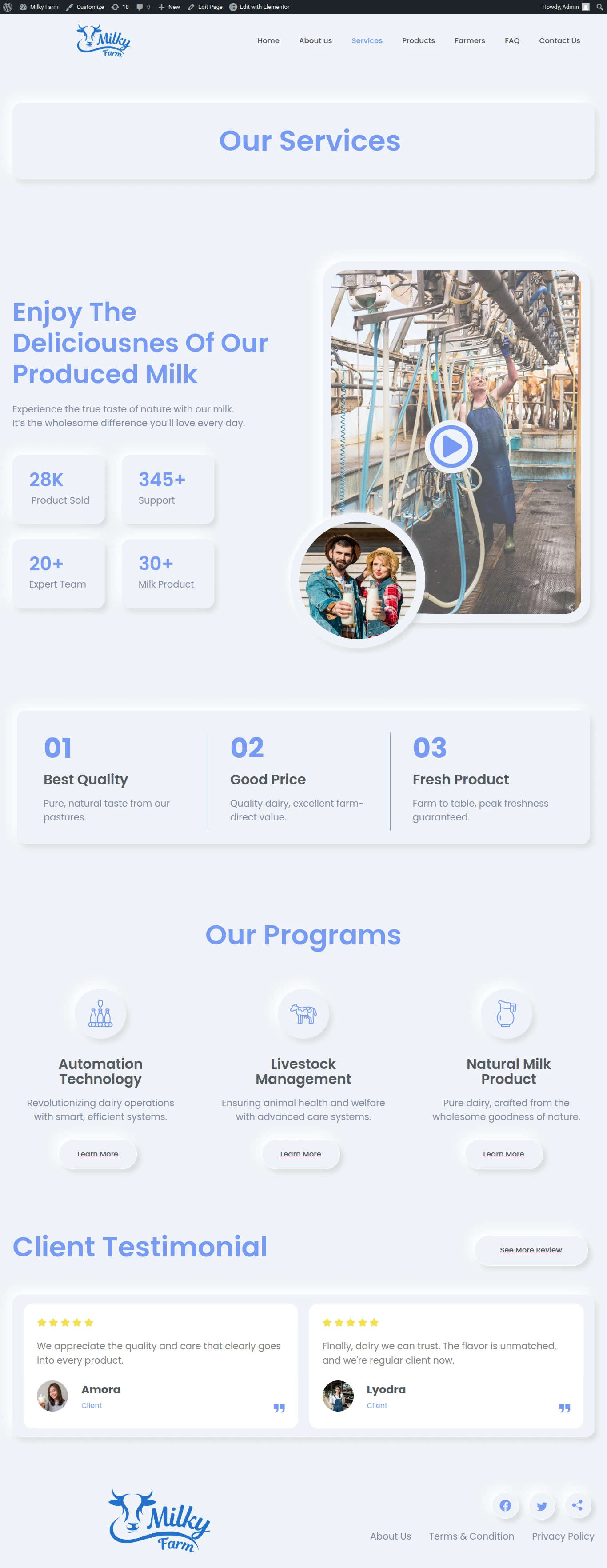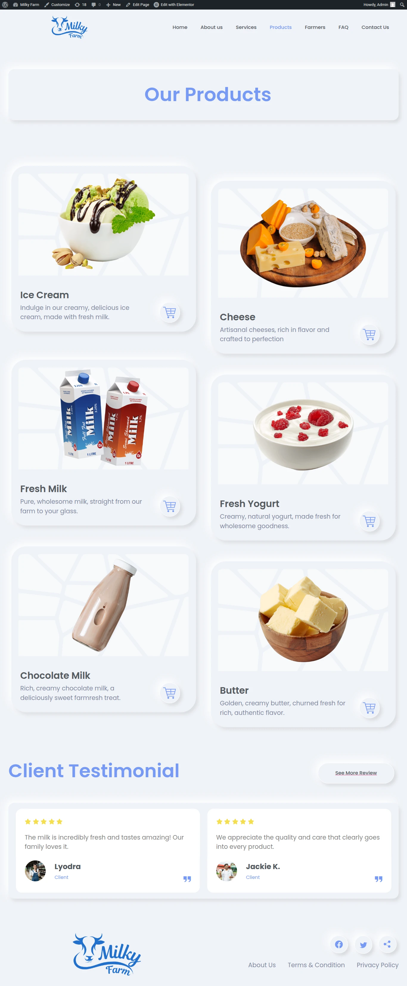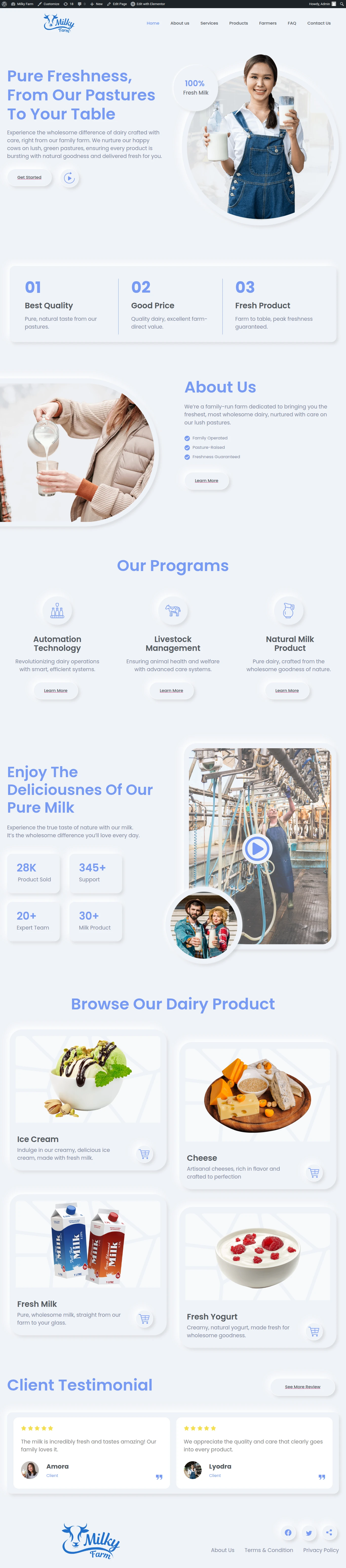 This website was built for Milky Farm, an organic dairy producer specializing in fresh milk, artisanal cheeses and farm-fresh yogurt. The client wanted to highlight their sustainable farming practices, showcase product offerings and enable online wholesale and subscription orders. The goal was to share the farmās story, build customer trust and simplify the ordering process for retailers and direct consumers.