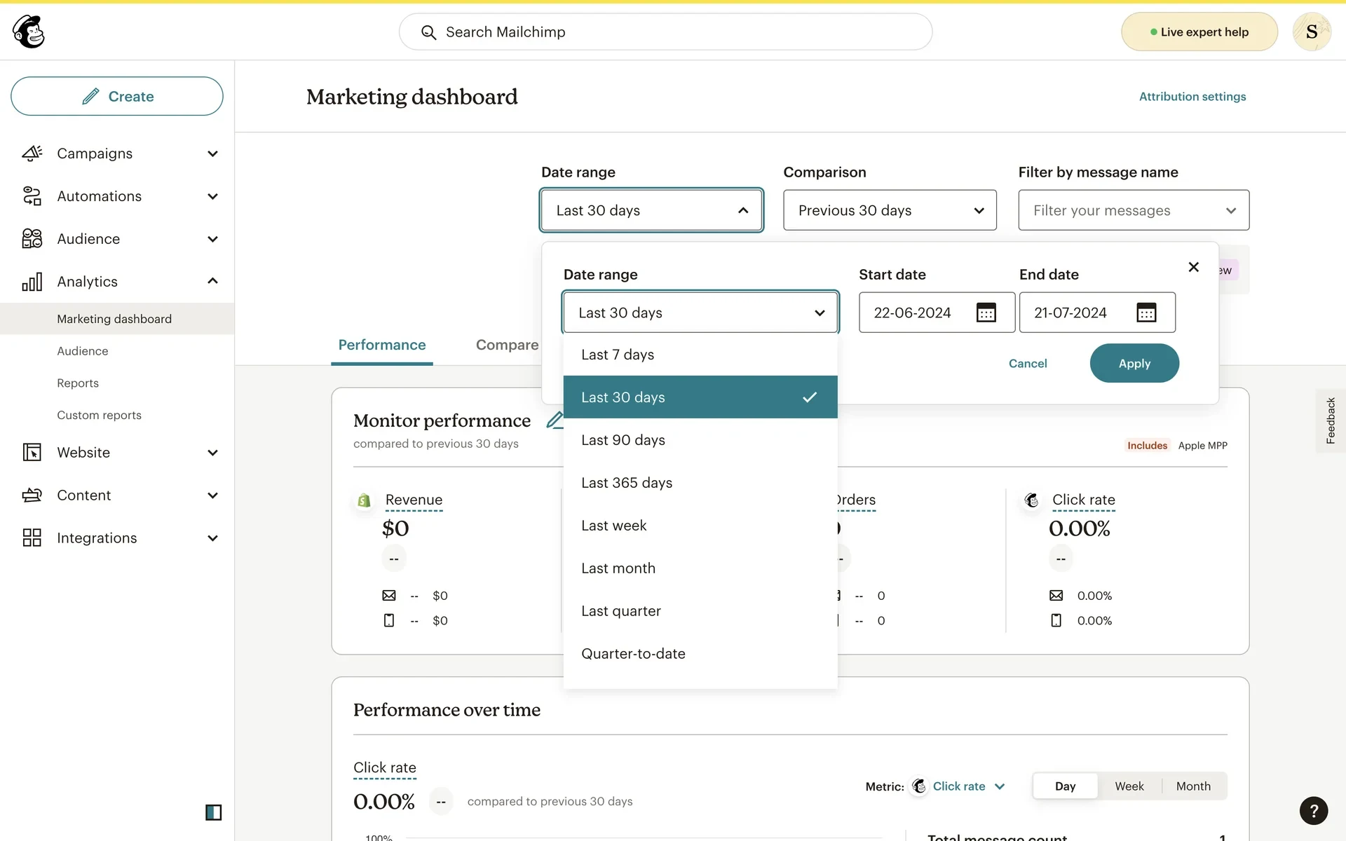 Preset ranges: Last 7/30/90/365 days, last week/month/quarter, quarter-to-date
