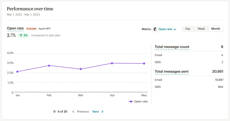 MailChimp users could only view campaign metrics one campaign at a time. There was no way to see overall marketing performance, identify trends, or understand if their email program was working.