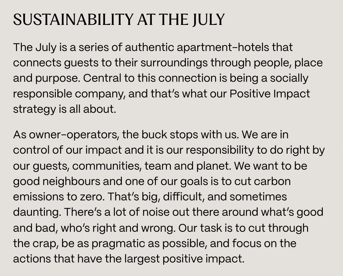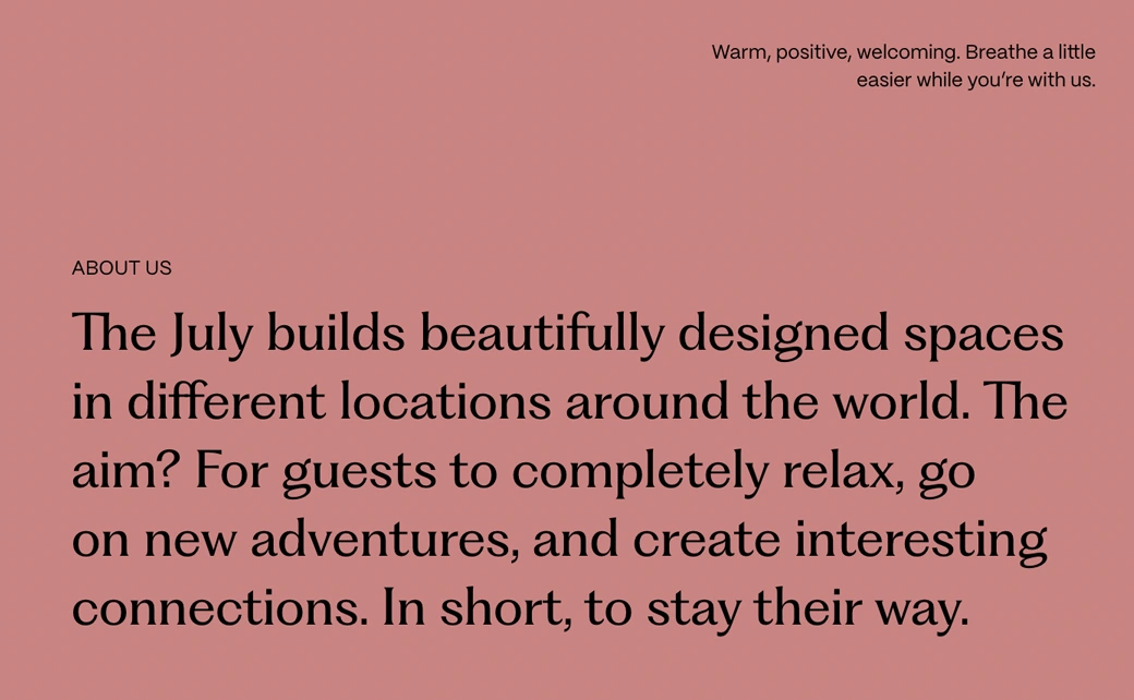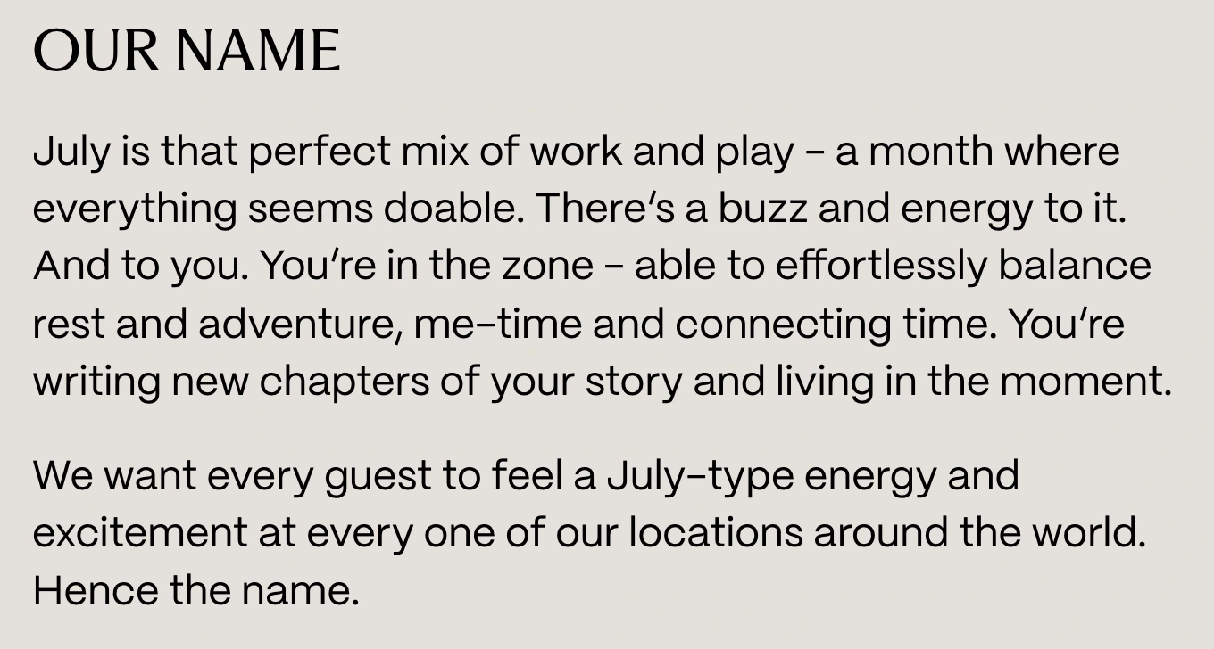 The July is a series of apartment-hotels across Europe. They were about to undergo a rebrand, shifting from a corporate persona to a more modern ‘bleisure’ guest. My task was to create a new verbal identity that could excite internal stakeholders, retain existing guests and attract new ones.