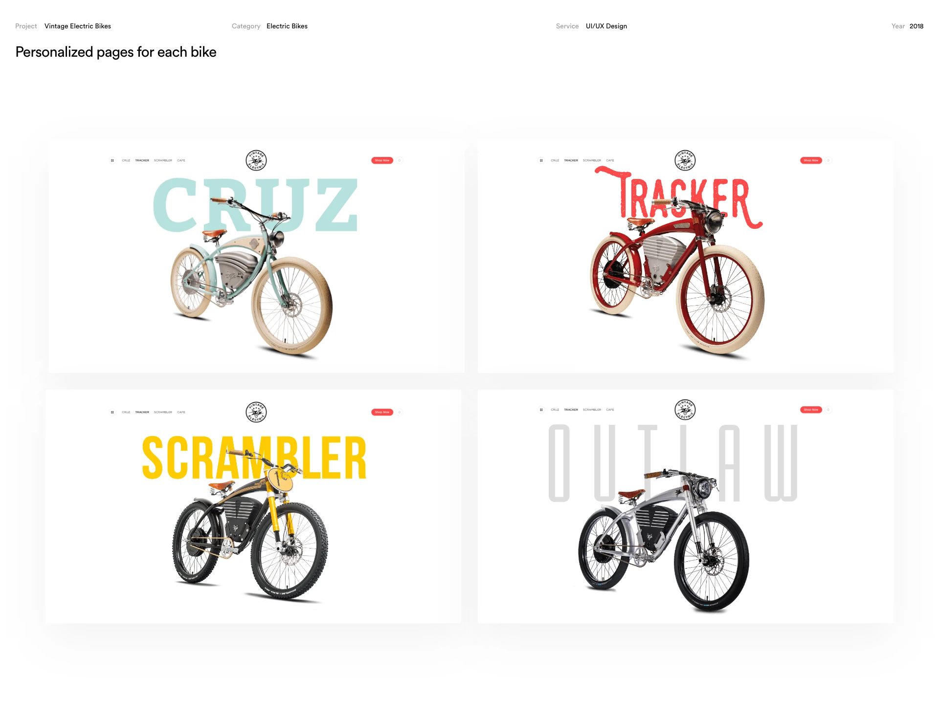 Considering each bike's different personality, we decided to evolve design around this idea and designed personalized pages for each bike and highlight them with typography and color. This allowed us to design a simple and elegant online shop experience.