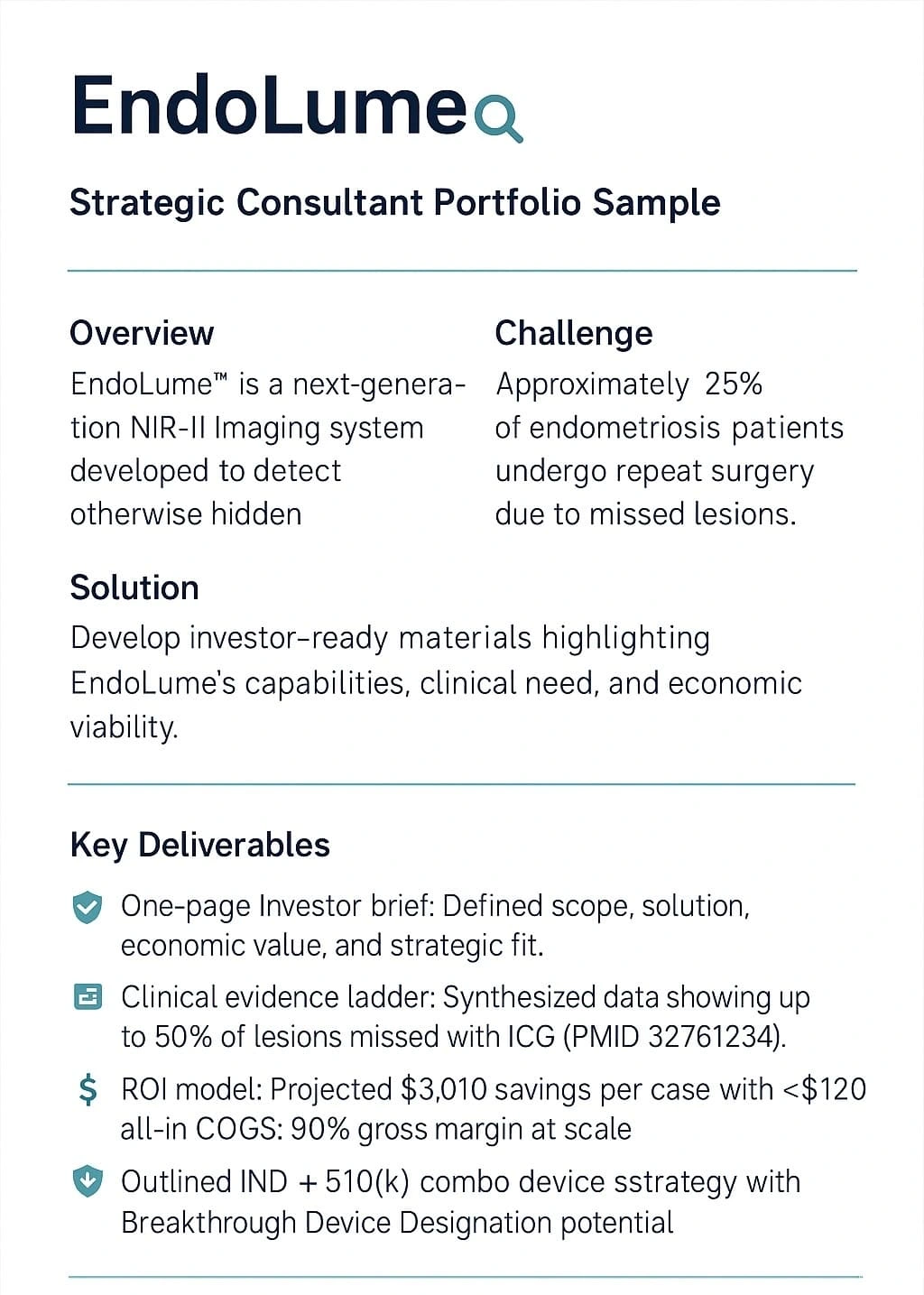 This portfolio sample highlights my work supporting a next-generation NIR-II imaging platform designed to improve surgical outcomes for endometriosis patients. I helped shape the project’s investor and acquisition narrative, addressing both clinical and economic pain points with a streamlined package of strategic materials.