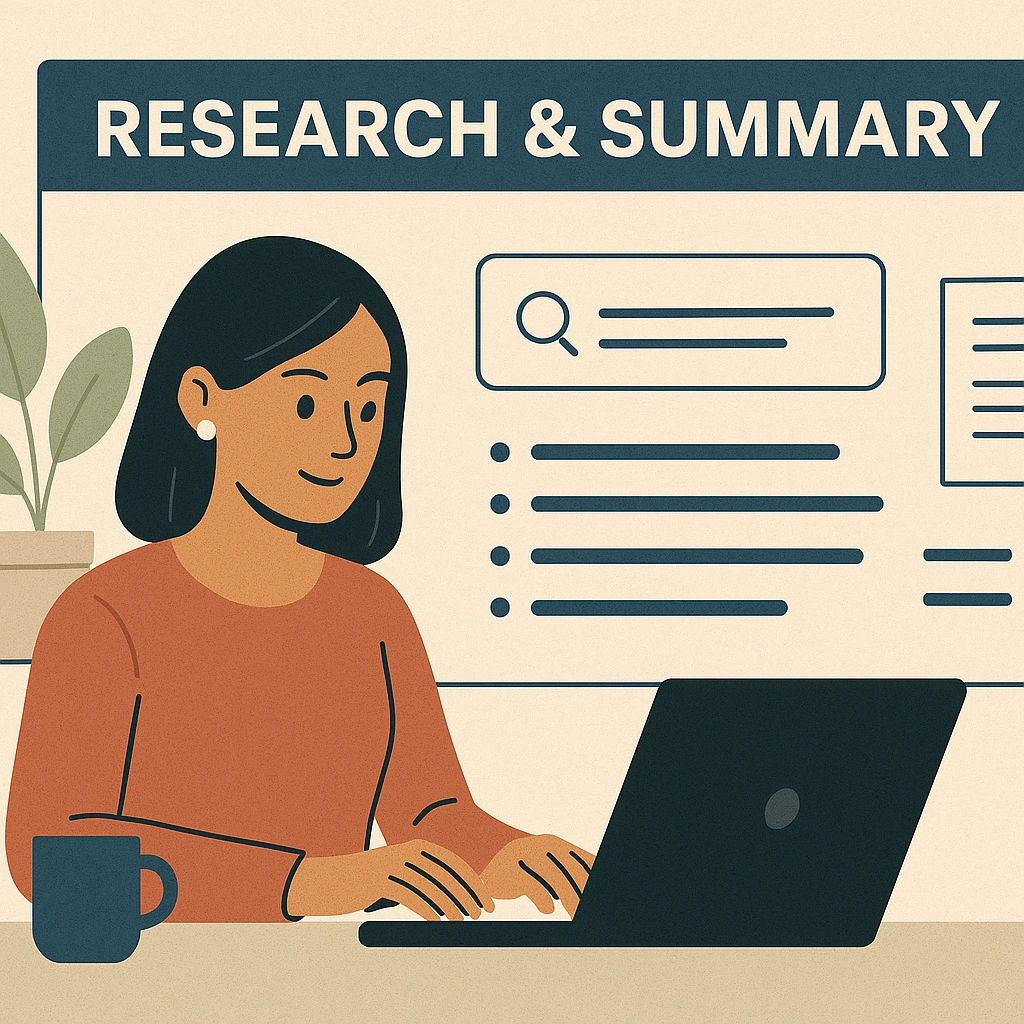Conducted detailed online research and created clear, concise summaries to support content creation, market analysis, and informed decision-making.